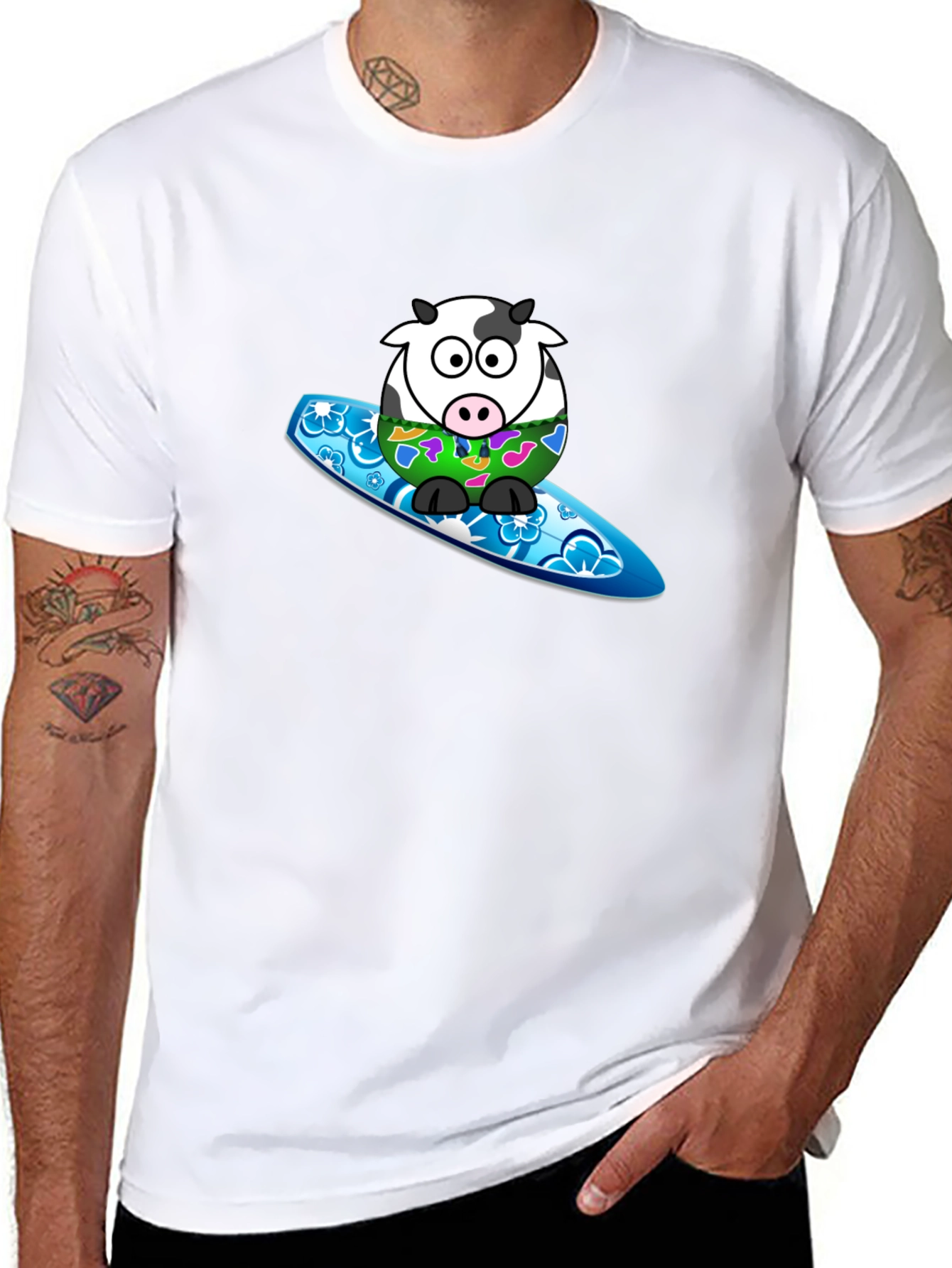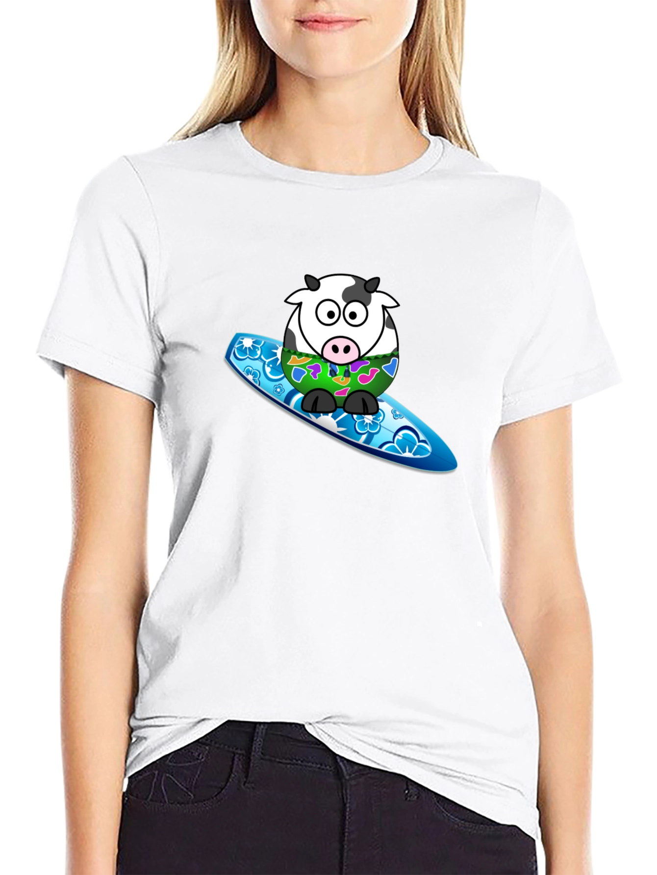 Catch a wave of fun with this unique graphic t-shirt! Featuring a cartoon cow sporting a colorful Hawaiian shirt and riding a bright blue surfboard, this tee is sure to turn heads. The playful design is printed on a soft, breathable black fabric, making it comfortable for everyday wear. Perfect for casual outings, beach trips, or anyone who loves quirky and fun fashion. This shirt is a great way to express your playful side and add a touch of whimsy to your wardrobe. Get ready to ride the style wave!
