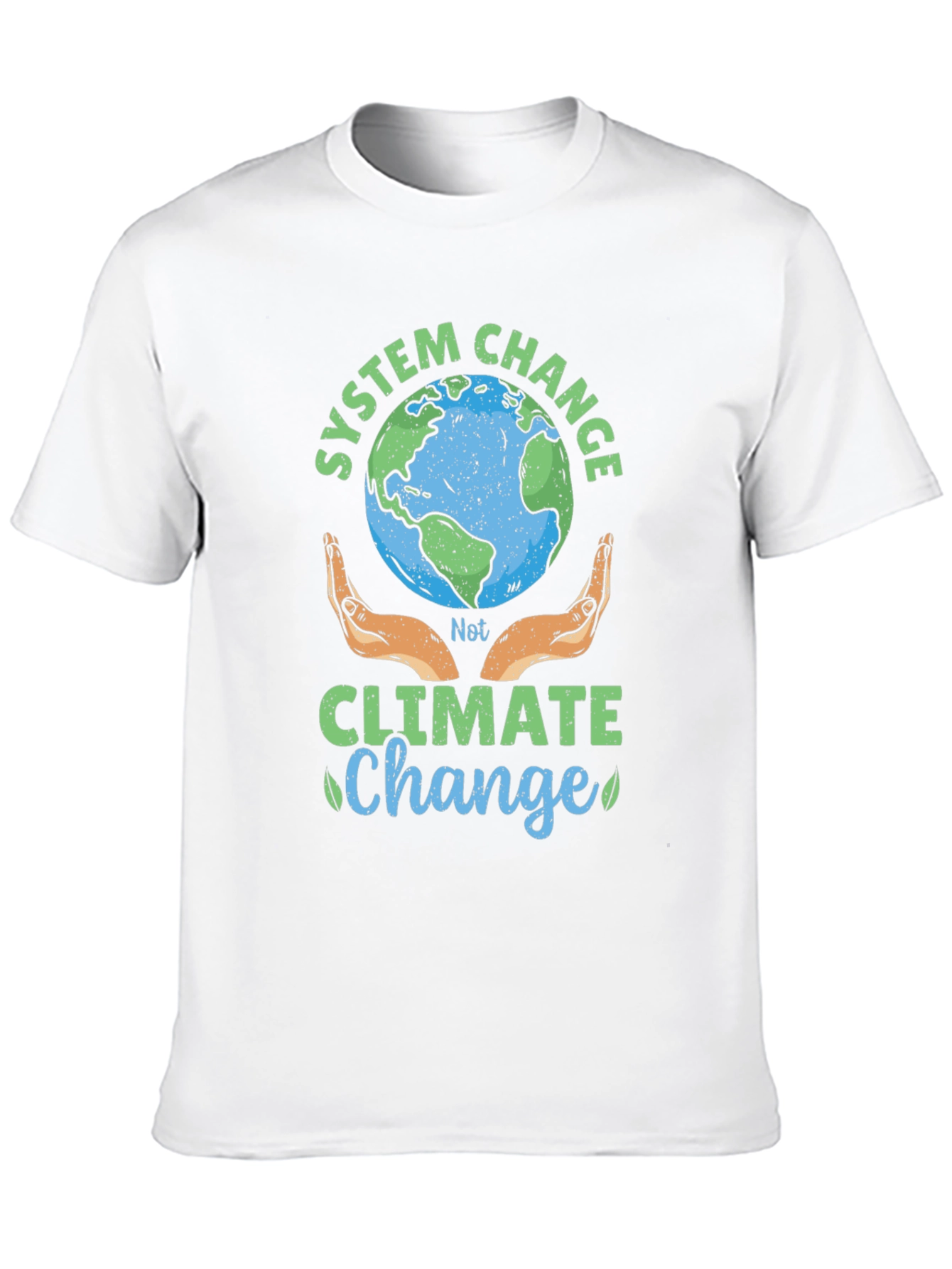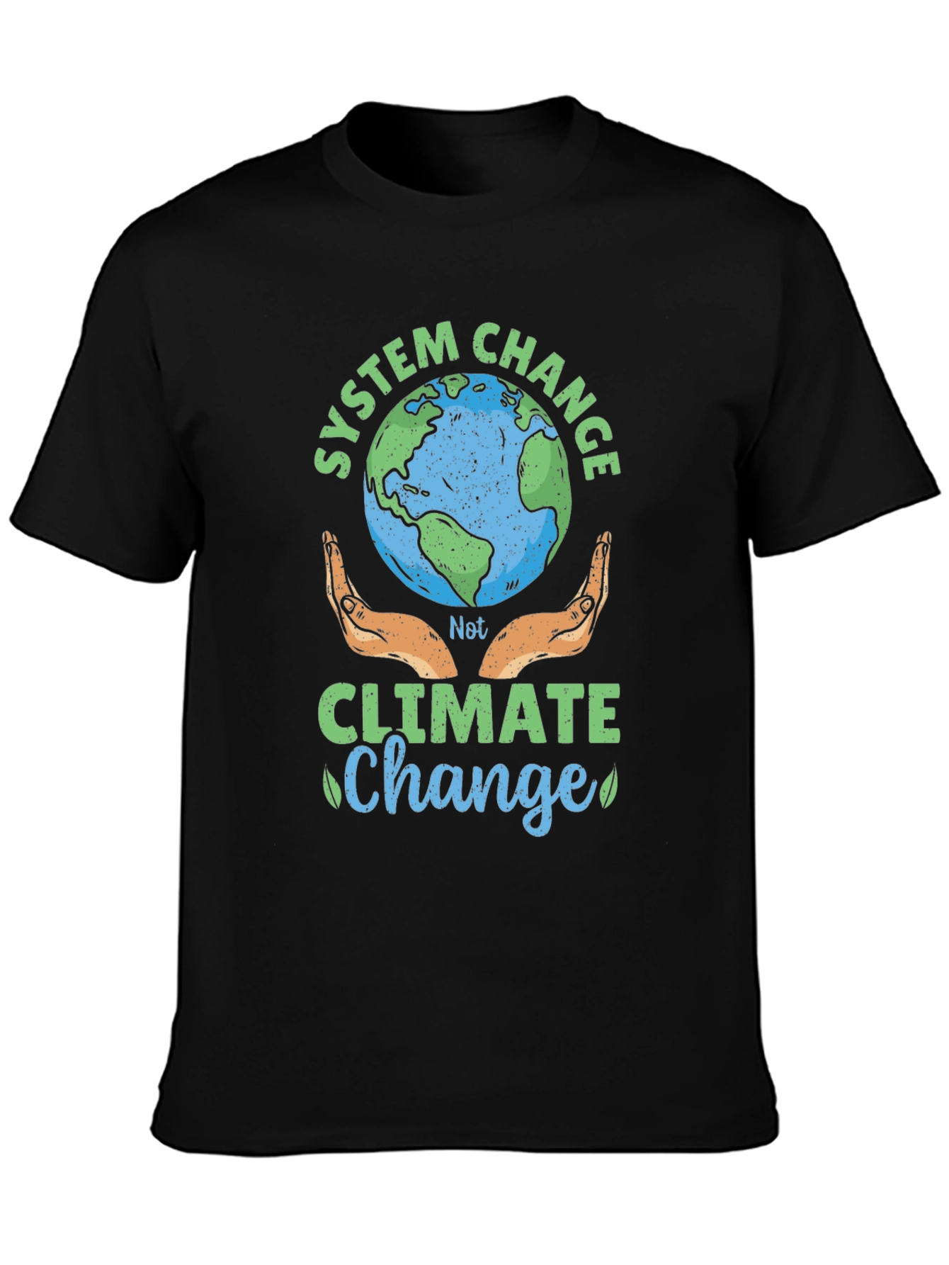 Show your support for environmental awareness with this bold graphic tee. The black t-shirt features a vibrant design with the words "System Change Not Climate Change" encircling a detailed earth globe. The imagery includes hands cradling the earth. This comfortable, classic fit shirt is perfect for casual wear, rallies, or everyday activism. Made from what appears to be soft, breathable fabric, it ensures all-day comfort. Stand out and spark conversations about creating a more sustainable world with this impactful statement piece.
