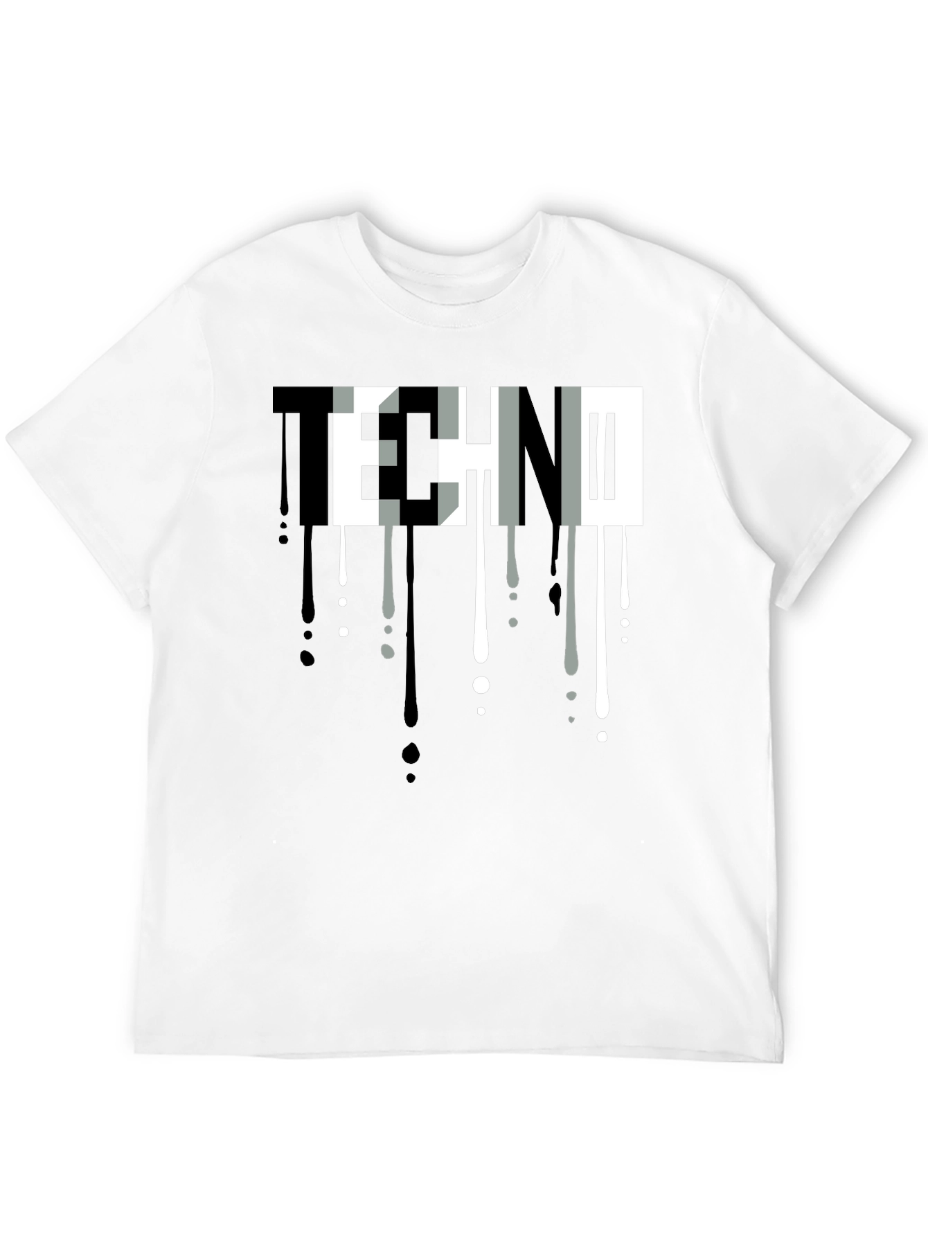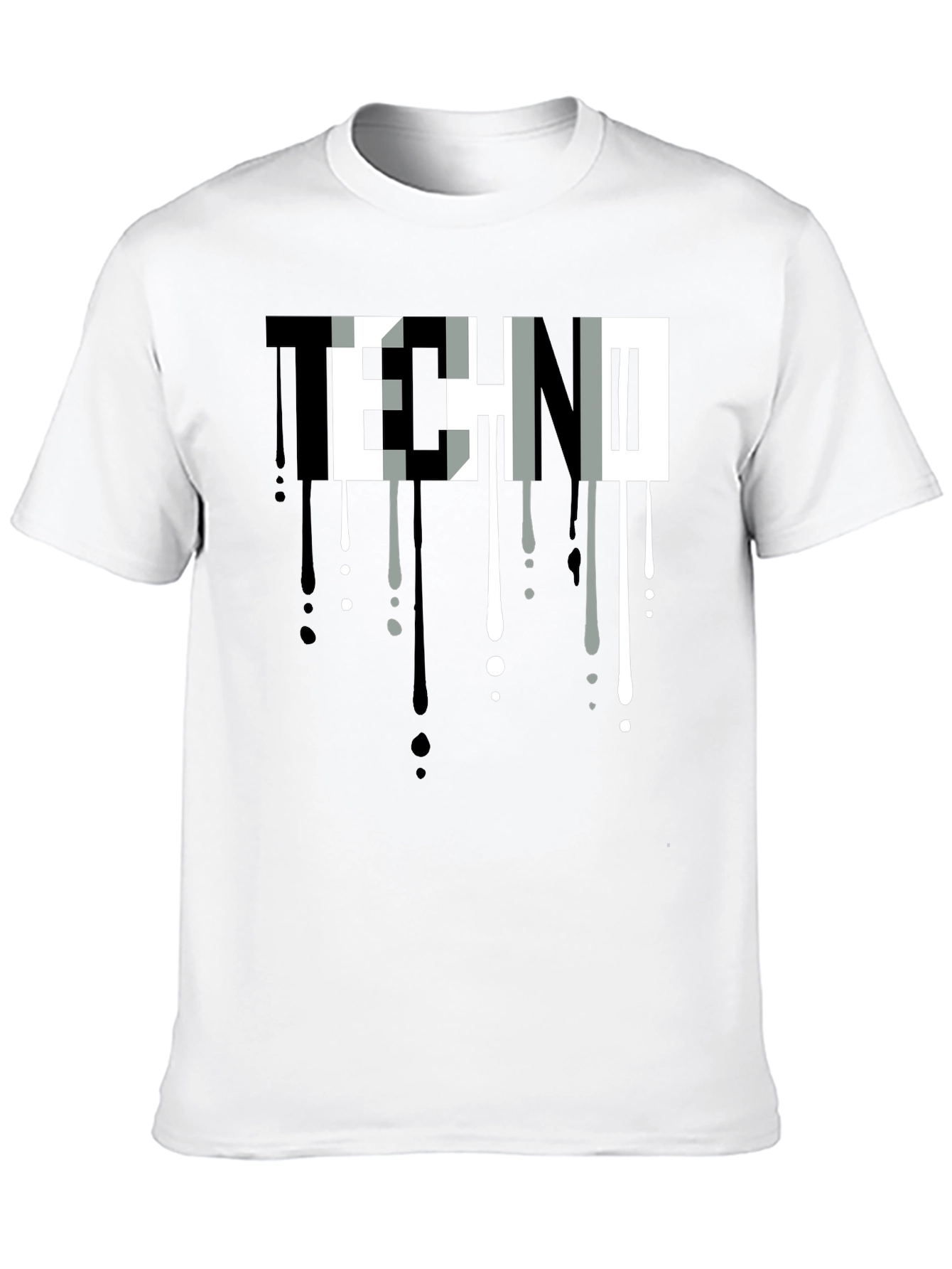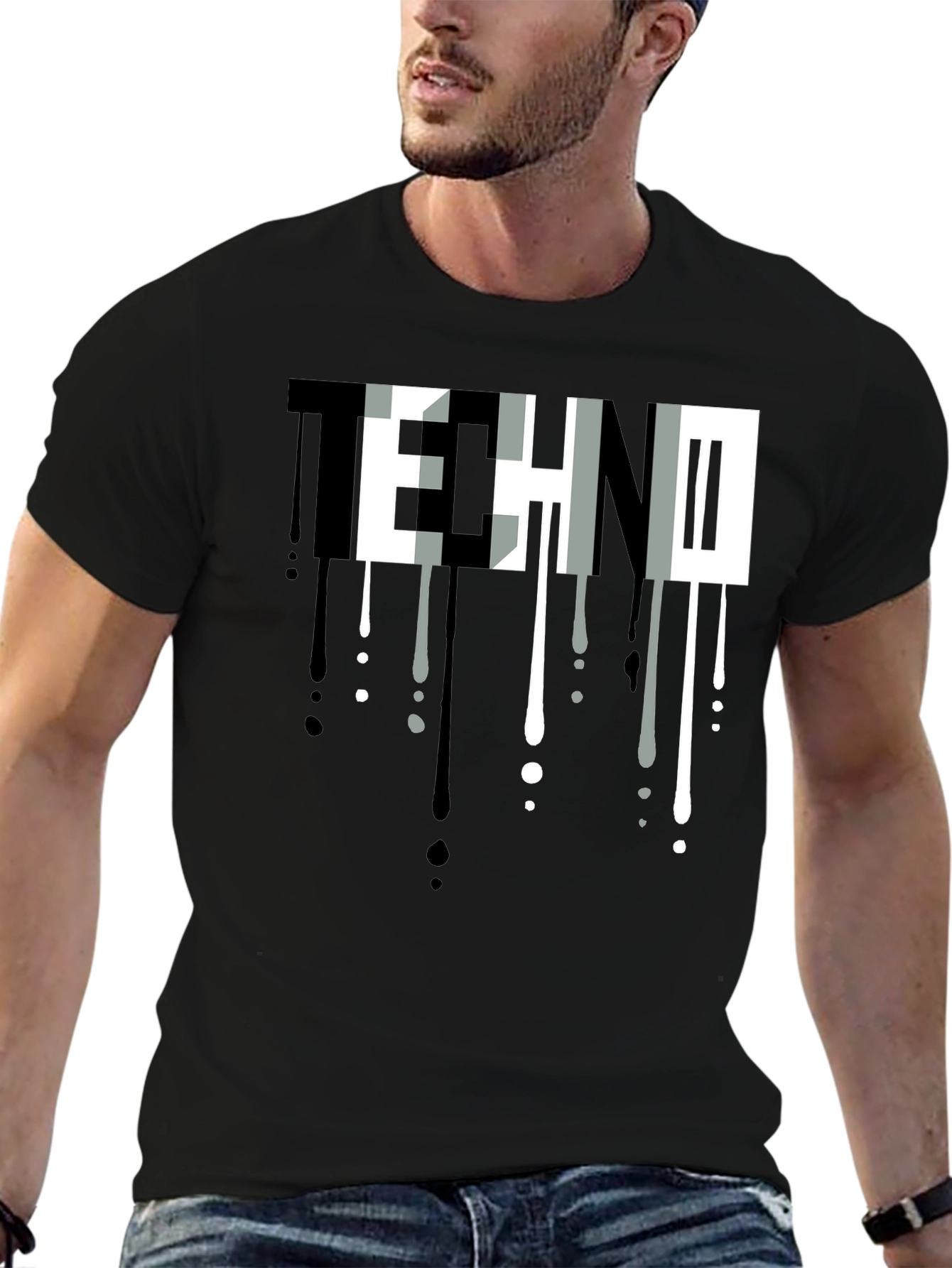 Showcase your love for techno music with this unique graphic tee. The shirt features the word 'TECHNO' in a bold, block letter design with a dripping paint effect in shades of grey and white. Made from a soft, breathable fabric, this t-shirt ensures all-day comfort. The classic black color provides a versatile backdrop for the eye-catching graphic, making it perfect for concerts, casual outings, or as a statement piece in your everyday wardrobe. Express your individuality with this trendy streetwear essential.