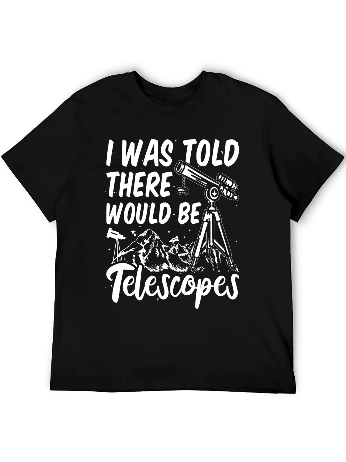 Show your love for astronomy with this eye-catching graphic tee! Made from soft, breathable cotton, this black t-shirt features a bold, white print that reads "I WAS TOLD THERE WOULD BE Telescopes". The design incorporates an illustration of a classic telescope against a backdrop of majestic mountains and twinkling stars. This unique tee is perfect for stargazers, science enthusiasts, or anyone with a passion for exploring the cosmos. Wear it to your next astronomy club meeting, a night of stargazing, or simply as a fun, everyday statement piece. Comfortable and stylish, this astronomy-themed t-shirt is sure to be a conversation starter.