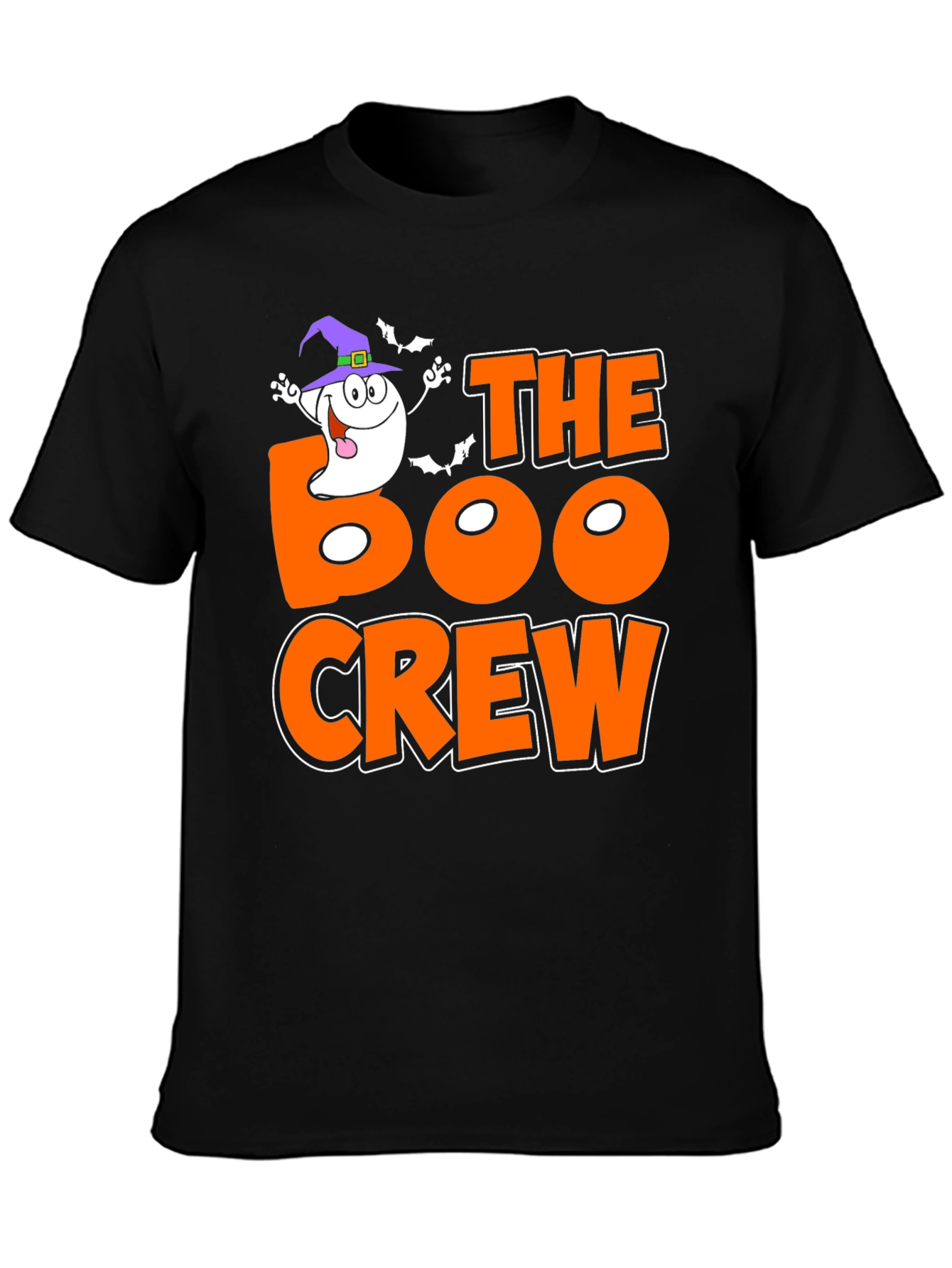 Get ready for spooky season with this fun and festive 'The Boo Crew' t-shirt! The shirt features a playful ghost graphic wearing a witch hat alongside bat accents. The text "The Boo Crew" is prominently displayed in a bold, orange font with a contrasting outline, making it pop against the shirt's solid black backdrop. Made from a comfortable, breathable fabric, this tee is perfect for Halloween parties, trick-or-treating, or just showing off your Halloween spirit. Its casual style makes it easy to pair with jeans, leggings, or your favorite costume accessories. A must-have for any Halloween enthusiast!