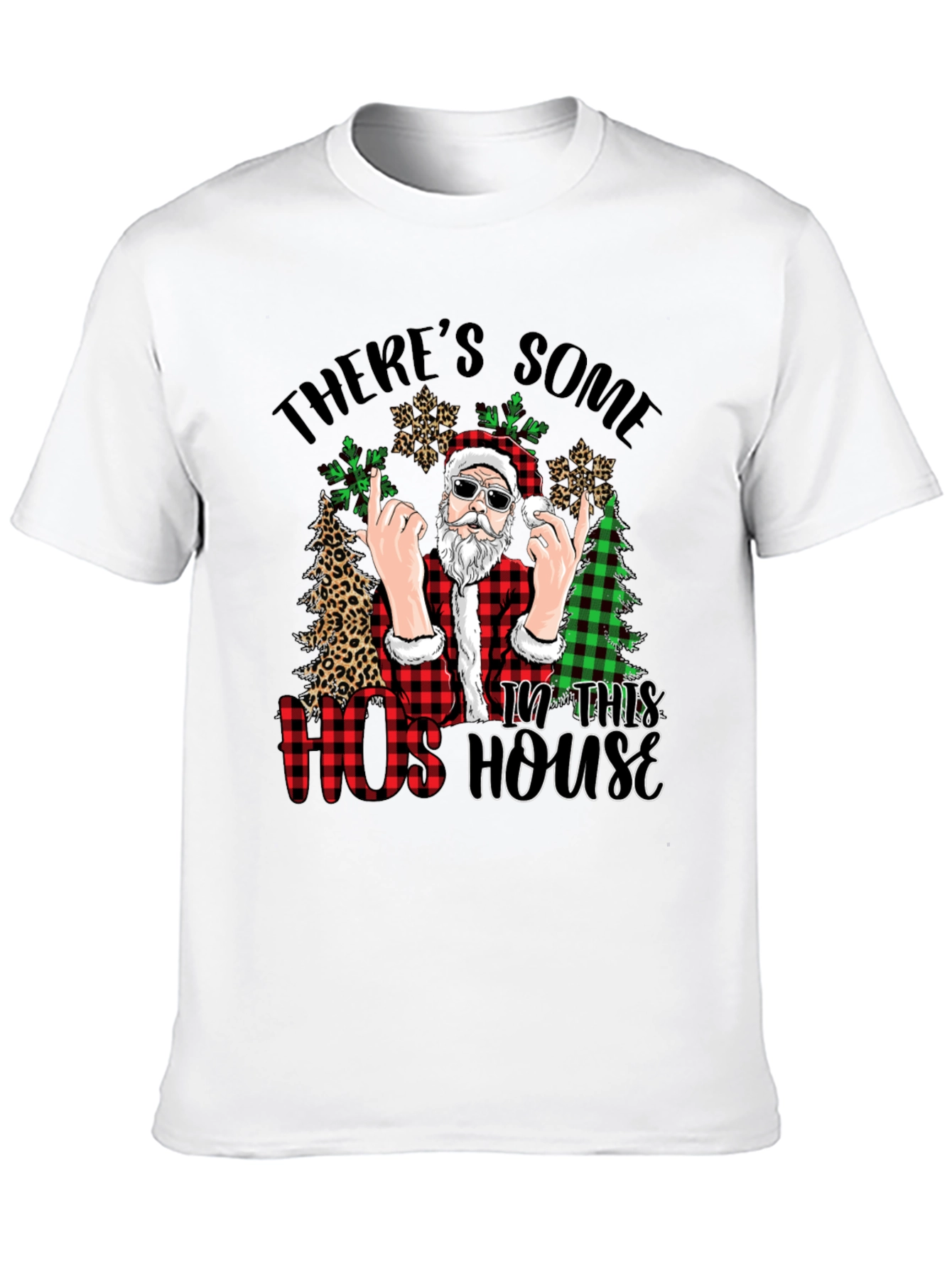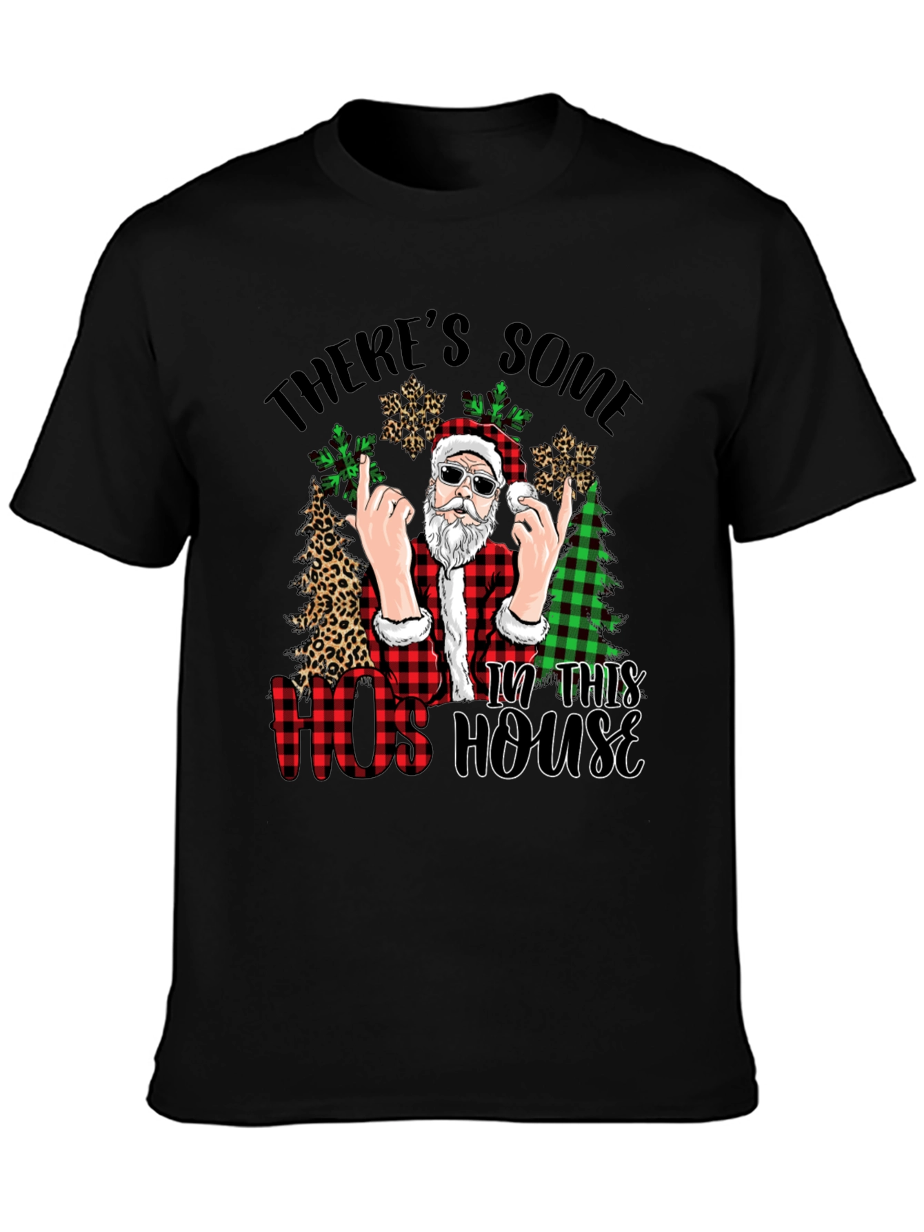 Get ready to spread some holiday cheer with a twist in this black graphic t-shirt. The shirt features a unique and humorous design with a Santa graphic. The Santa is wearing sunglasses, a red and black flannel and giving hand signals. He is surrounded by holiday elements with the cheeky phrase "There's Some Hos in This House". This is perfect for casual wear, holiday parties, or as a fun gift for friends and family. The design is eye-catching and sure to spark conversation, adding a touch of humor to your festive wardrobe.