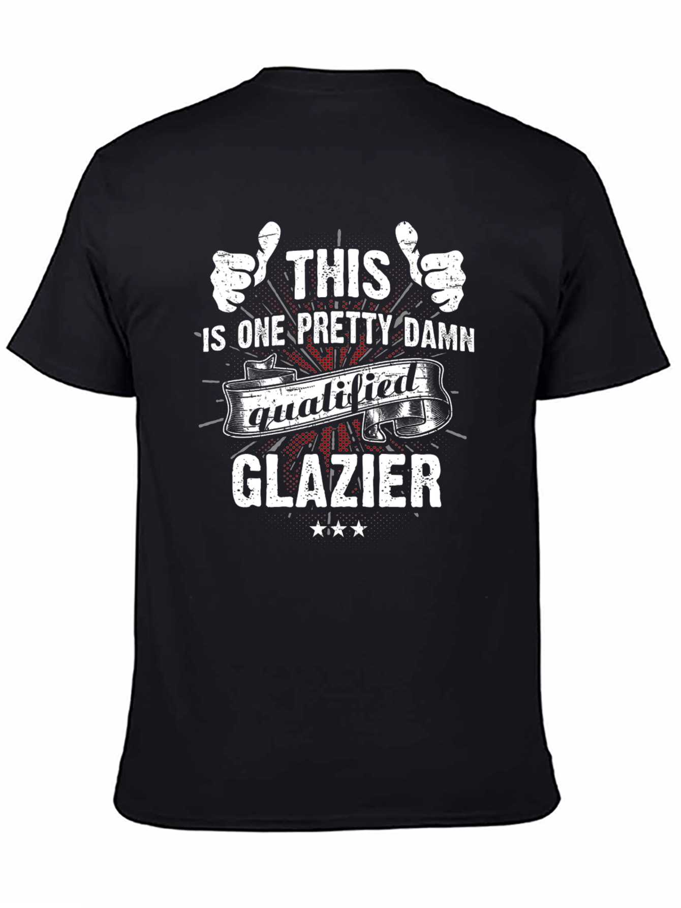 Show off your profession with this funny Glazier T-shirt. This black T-shirt features a humorous design with thumbs-up graphics and bold lettering. The design includes the phrase "THIS IS ONE PRETTY DAMN qualified GLAZIER" Perfect for everyday wear, work, or casual events. Show your glazier pride with a touch of humor! Makes a great gift for any glazier.