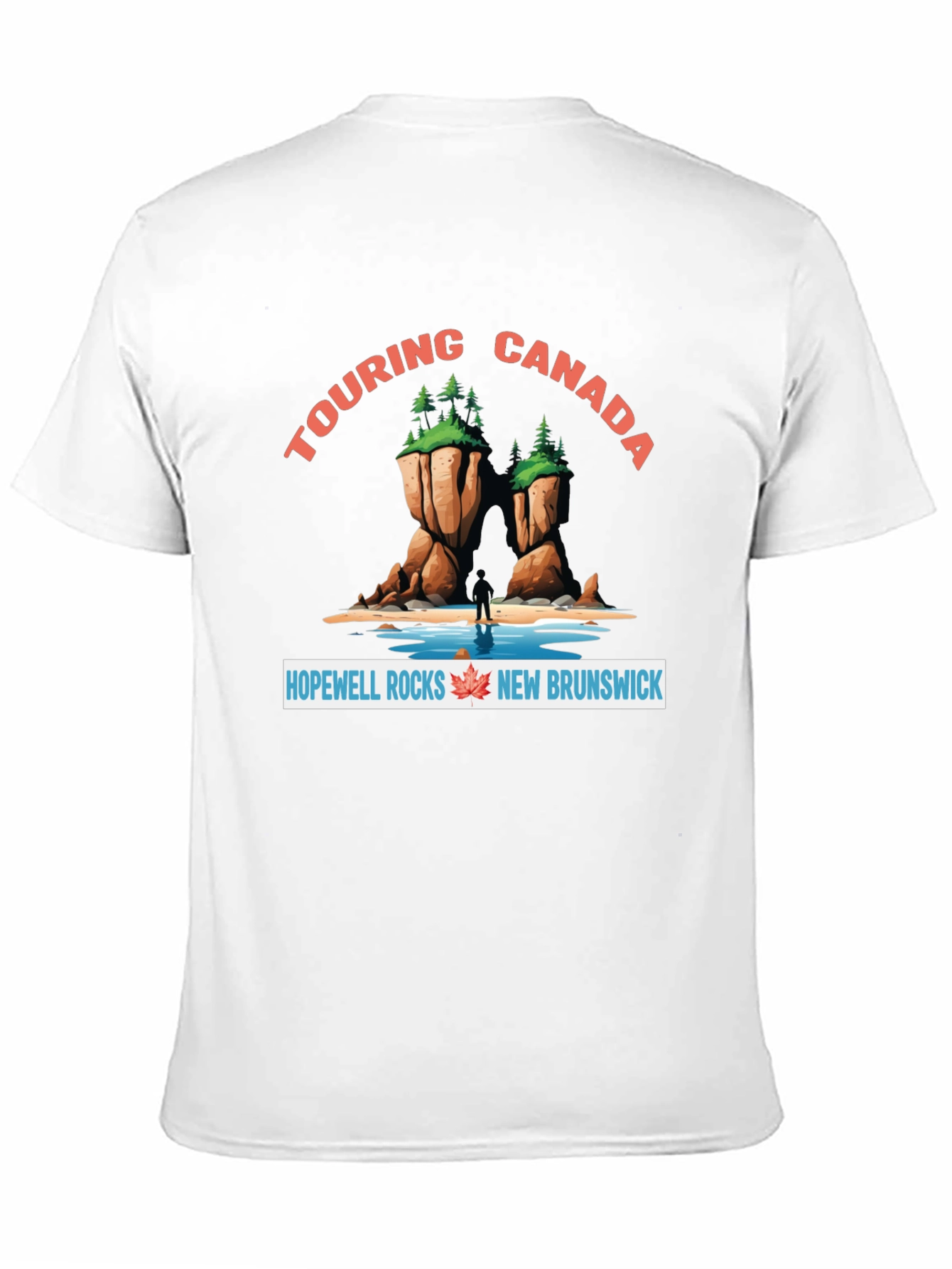 Show off your love for Canada with this stylish black t-shirt. Featuring a vibrant design of the iconic Hopewell Rocks in New Brunswick, this tee is perfect for travel enthusiasts. The bold "Touring Canada" text arches above the rock formations, creating an eye-catching visual. A maple leaf adds a touch of national pride. Made from a comfortable fabric, this shirt is ideal for casual wear or as a souvenir from your Canadian adventures. Available in various sizes, this t-shirt makes a great gift for anyone who loves to explore Canada's natural wonders.