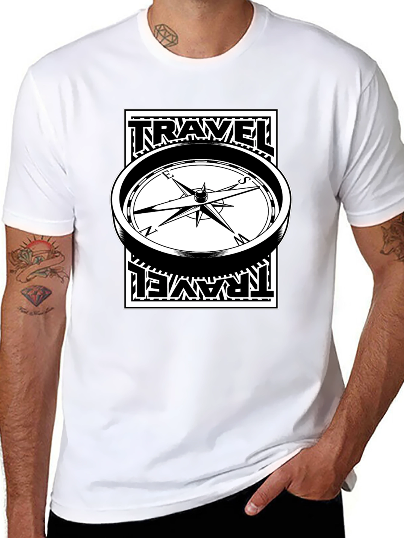 Embark on your next adventure in style with this eye-catching travel compass graphic tee! This classic black t-shirt features a bold, black and white compass design. The word "TRAVEL" is creatively integrated into the graphic, adding a touch of wanderlust. Made from comfortable, breathable cotton, this shirt is perfect for everyday wear or your next vacation. Showcase your passion for exploration with this unique and stylish graphic tee. Ideal for casual outings, travel enthusiasts, or anyone who loves a distinctive and comfortable t-shirt.