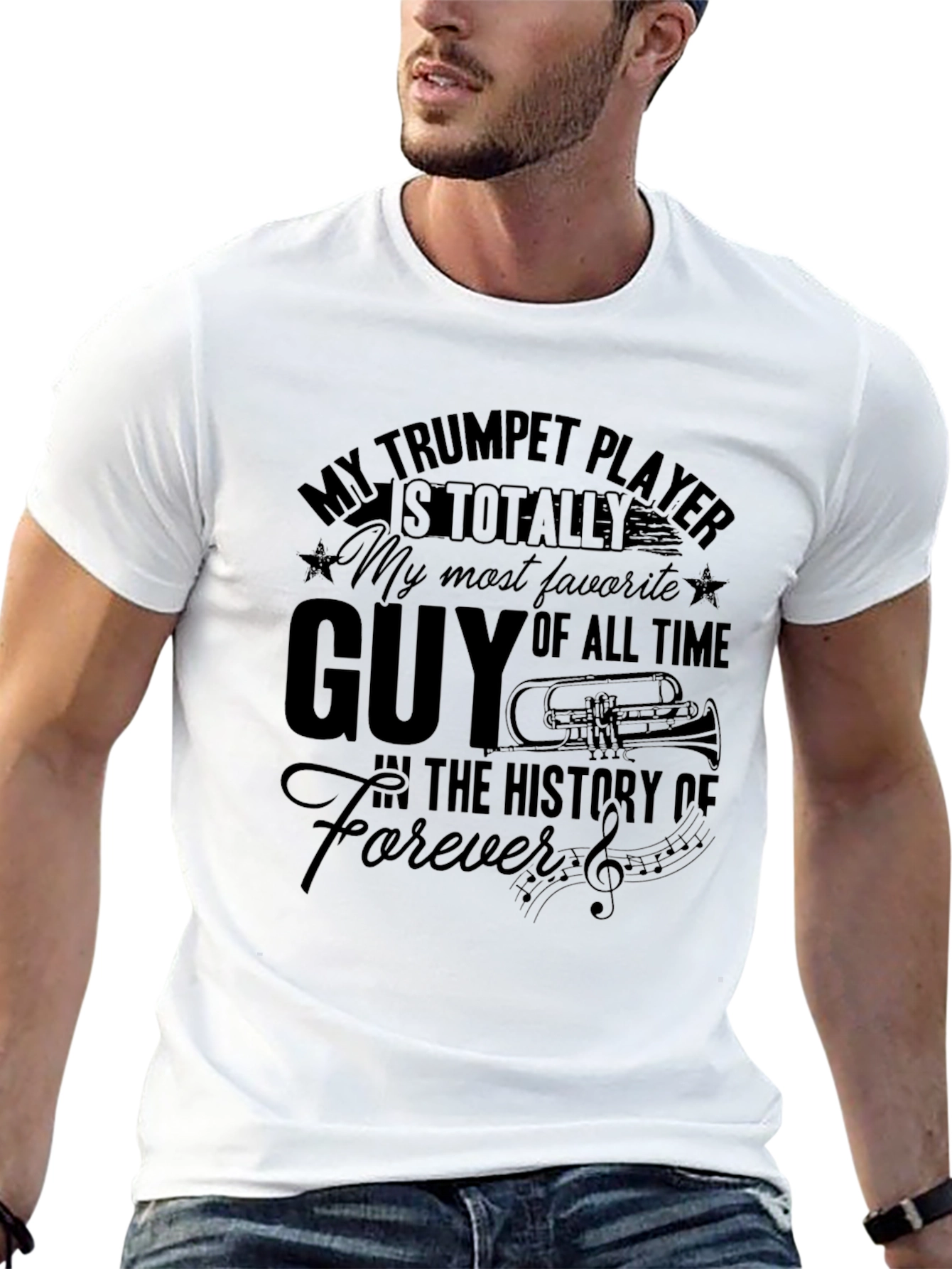 Show your support for your favorite trumpet player with this stylish black t-shirt. The shirt features a bold graphic design with the text 'My Trumpet Player is Totally My Most Favorite Guy of All Time in the History of Forever', accented with musical notes and a trumpet image. Made from a comfortable, soft fabric, this shirt is perfect for casual wear, music events, or as a thoughtful gift for any trumpet enthusiast. Its classic fit ensures a flattering look for everyone. Wear it proudly and let everyone know who your favorite trumpet player is!