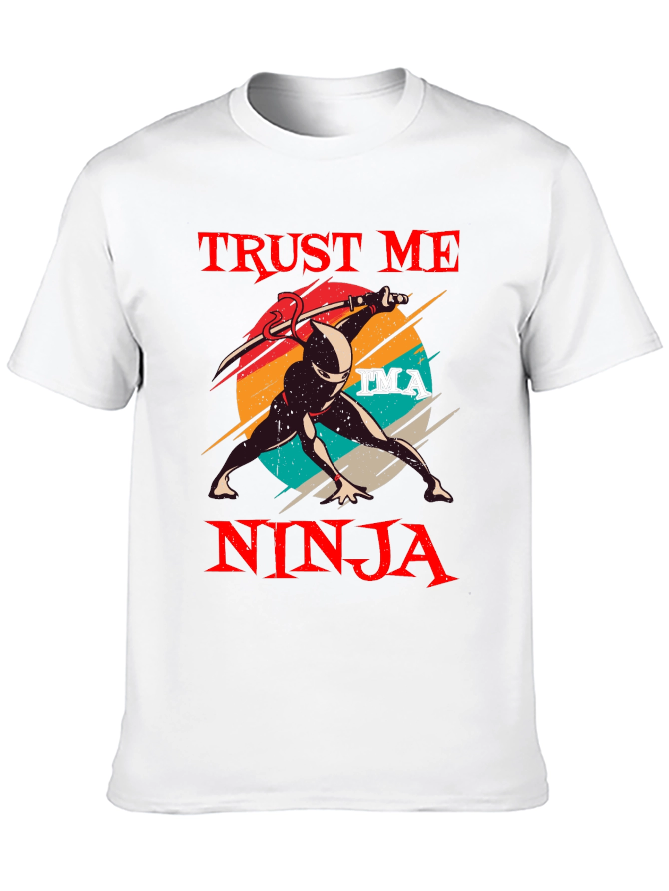 Show off your playful side with this eye-catching black t-shirt. The shirt features a bold graphic of a ninja in action, set against a retro-style sunset backdrop. "TRUST ME I'M A NINJA" is printed in a striking red font, adding a touch of humor to the design. Made from a comfortable, breathable fabric, this t-shirt is perfect for everyday wear or casual outings. Its unique design is sure to turn heads and spark conversations. Ideal for ninja enthusiasts or anyone with a fun sense of humor.