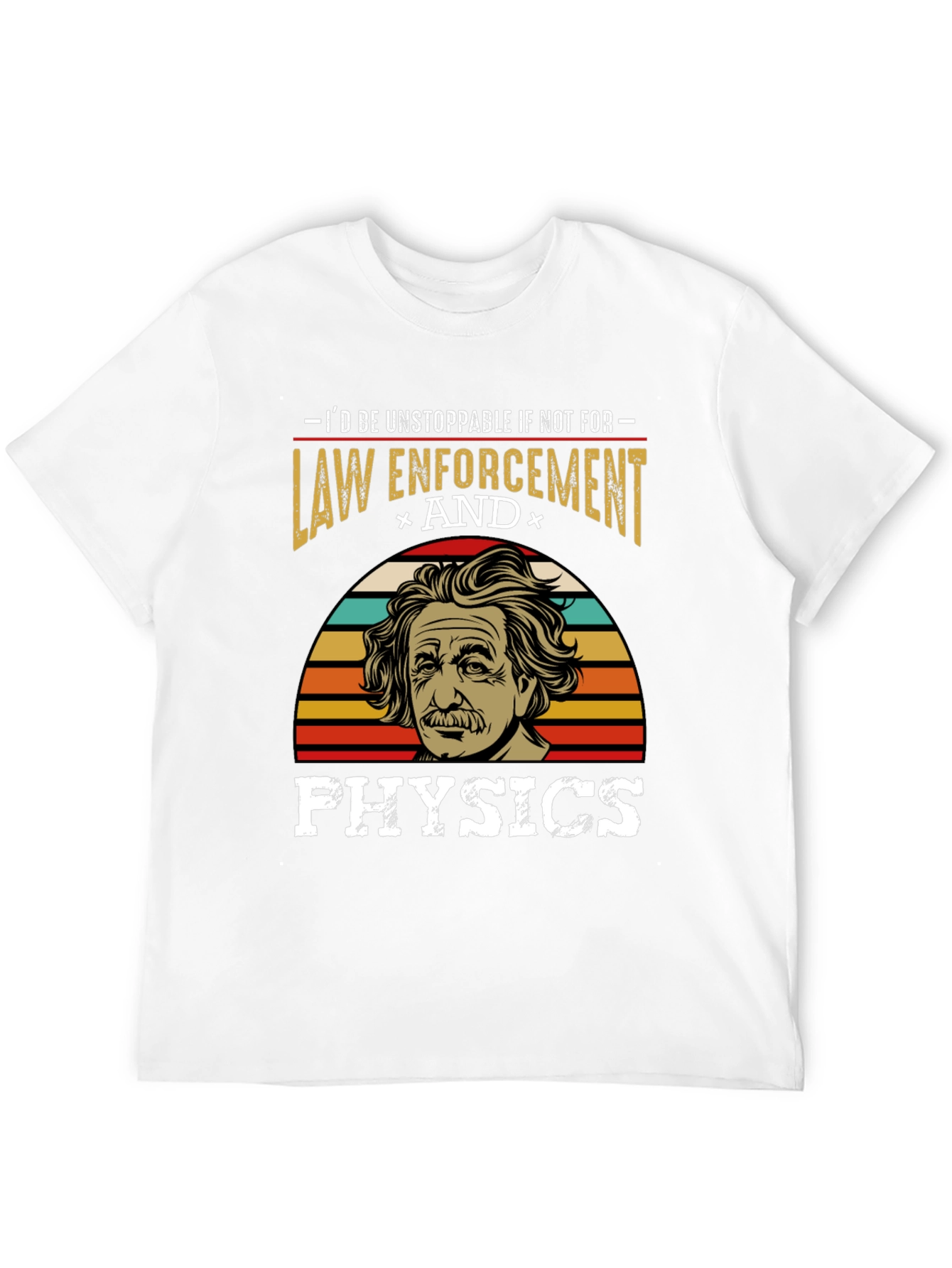 Show off your witty side with this black t-shirt featuring the funny quote "I'd Be Unstoppable If Not For Law Enforcement And Physics". This comfortable tee showcases a vibrant graphic design, including a vintage-style striped background and Albert Einstein. Made from a soft, breathable fabric, it's perfect for casual wear and makes a statement wherever you go. Get ready to turn heads and spark conversations with this unique and humorous tee. Ideal for physics enthusiasts, law enforcement supporters, or anyone with a great sense of humor. A must-have addition to your wardrobe.