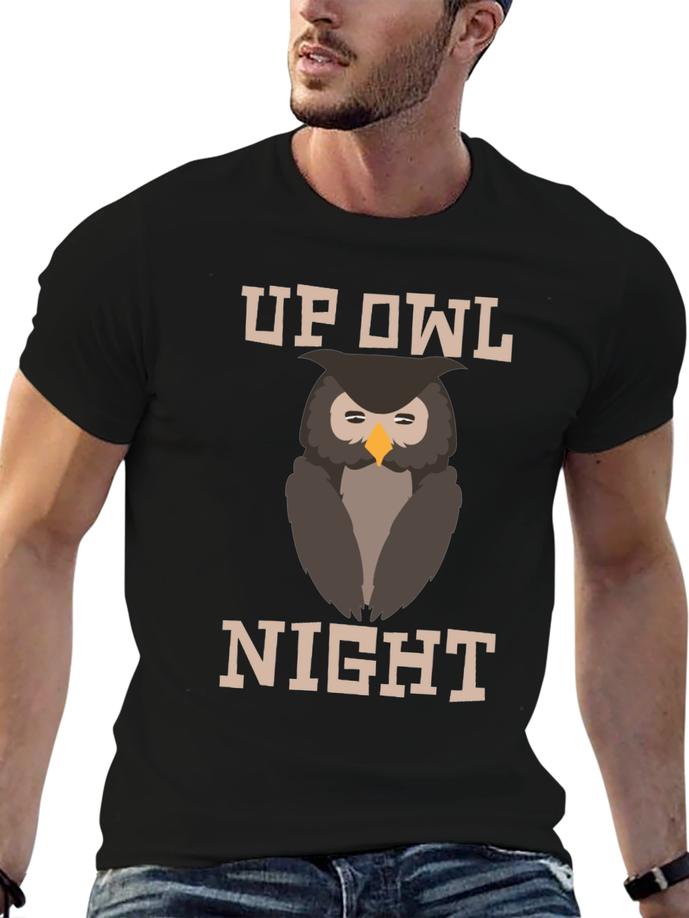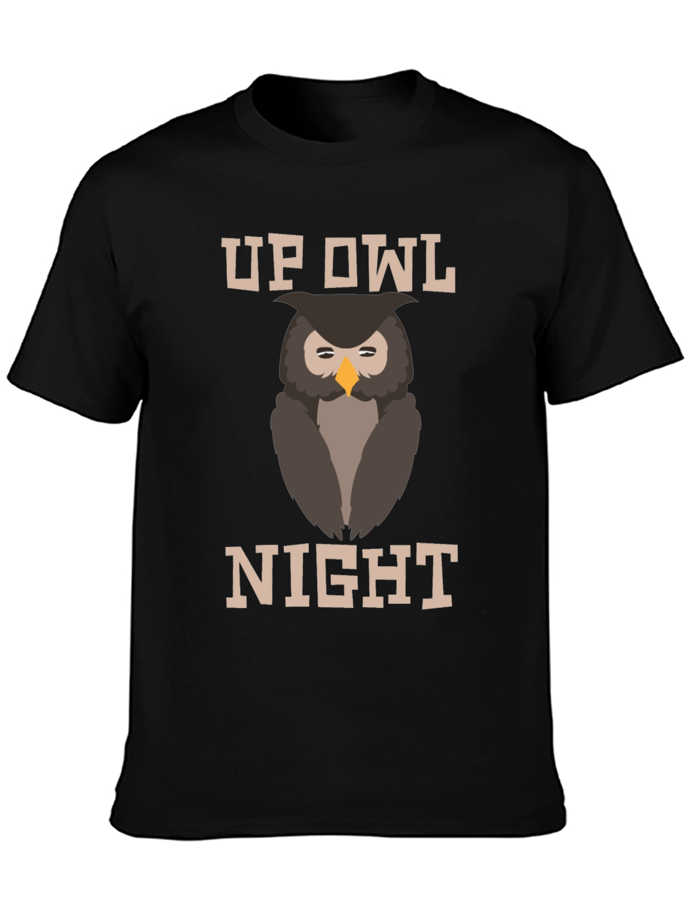 Stay stylishly awake with this fun "Up Owl Night" graphic t-shirt! The tee features a cute cartoon owl graphic between the words "UP" and "NIGHT" in a bold, blocky font. This comfy t-shirt is perfect for night owls, students pulling all-nighters, or anyone who loves owls. It is made from a soft fabric, ideal for casual wear. Wear it to school, around town, or while you're burning the midnight oil. Show off your love for late nights and quirky style!