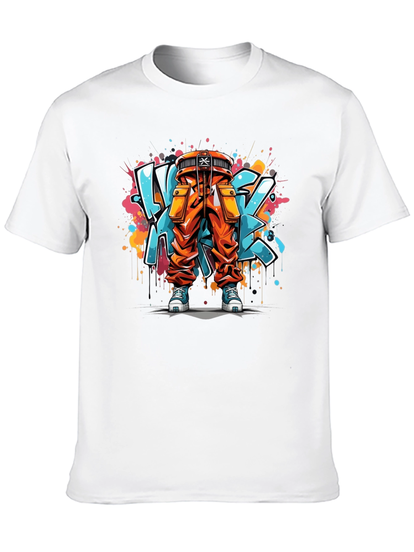 Embrace urban flair with this unique black t-shirt featuring a vibrant graffiti art design. The artwork showcases a stylized orange cargo pants character with a matching belt and cool blue sneakers, all set against a backdrop of dynamic, colorful graffiti. Made from comfortable, breathable fabric, this tee is perfect for casual wear, street style outfits, or expressing your artistic side. Stand out from the crowd and make a statement with this eye-catching and trendy t-shirt that blends fashion and street art seamlessly. Ideal for those who love unique graphic tees and bold designs.