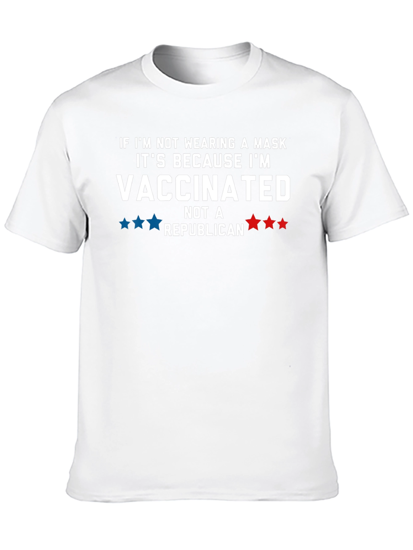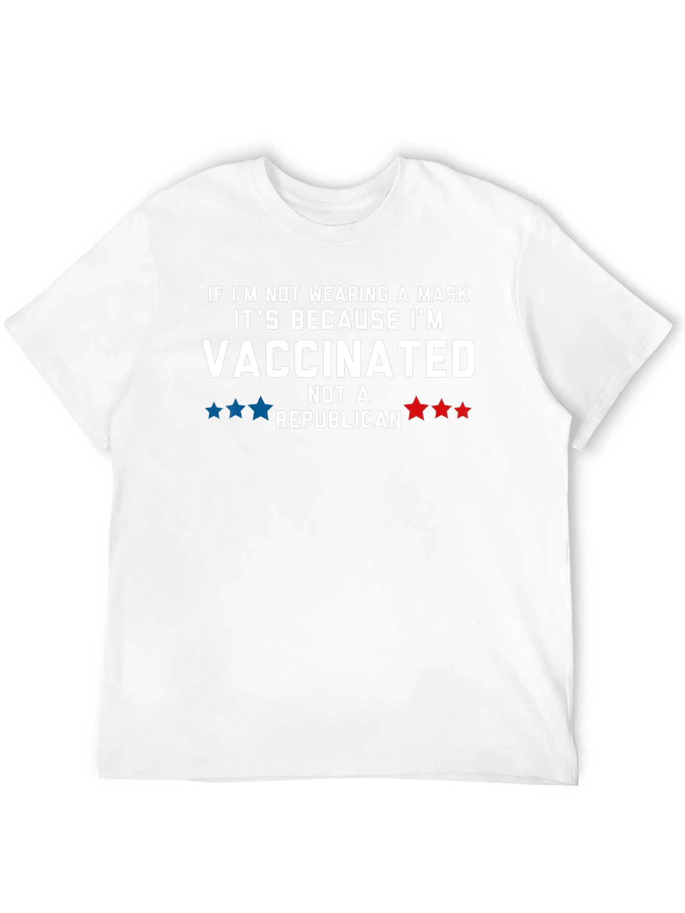This black t-shirt features a bold statement: "If I'm not wearing a mask it's because I'm VACCINATED not a REPUBLICAN." The text is in white, with blue stars and red stars. This unique design is printed on a soft and comfortable tee, perfect for expressing your views with style and humor. Ideal for casual wear, political gatherings, or simply making a statement, this t-shirt is a conversation starter. It's a great way to show your support for vaccination while highlighting your political stance. A must-have for anyone who wants to combine fashion with a clear message.