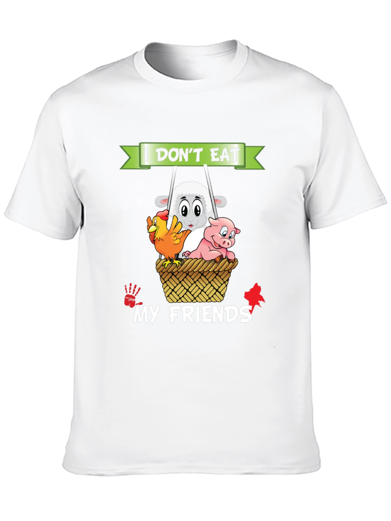 Show your love for animals with this unique "I Don't Eat My Friends" t-shirt! This eye-catching black tee features a charming graphic of a sheep, pig, and chicken nestled in a woven basket, suspended from a banner that boldly proclaims, "I DON'T EAT." The vibrant design is a playful yet powerful statement of your commitment to a vegan lifestyle and animal rights. Made from a comfortable material, this t-shirt is perfect for everyday wear, vegan events, or spreading awareness. Let your clothes do the talking and inspire conversations about compassionate living. A great gift for vegans, vegetarians, and animal lovers alike!