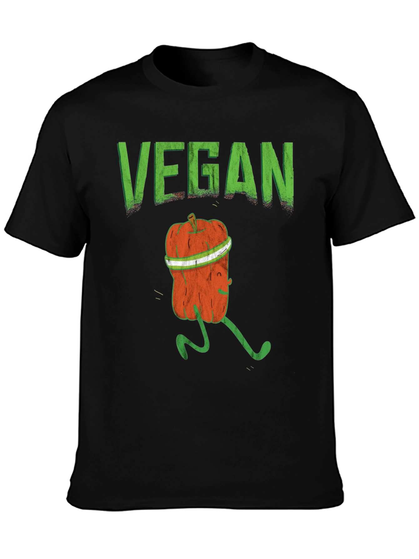 Show off your plant-powered pride with this unique black cotton t-shirt! The design features the word "VEGAN" in bold, green letters, complemented by a playful graphic of a running pumpkin character. This fun and quirky tee is perfect for everyday wear, workouts, or vegan events. Made from comfortable, breathable cotton, it offers a relaxed fit and feel. Great gift for the vegan or vegetarian in your life. Add some humor and style to your wardrobe with this eye-catching tee!