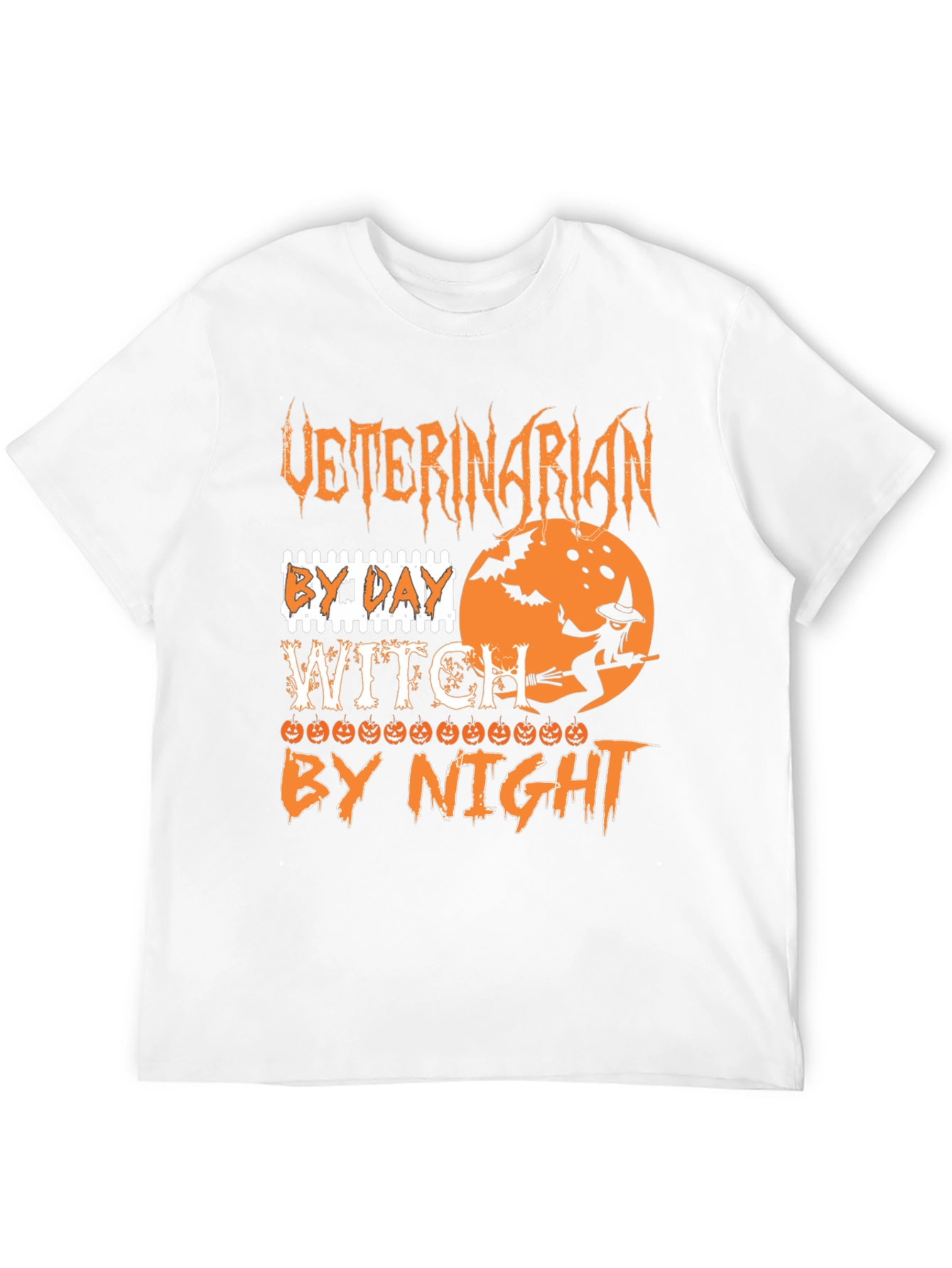 This novelty t-shirt features a playful Halloween-themed design, ideal for veterinarians with a sense of humor. The graphic showcases the phrase "Veterinarian by Day, Witch by Night" in a spooky, decorative font. An image of a witch flying on a broomstick against a full moon with bats adds to the whimsical appeal. The design also incorporates pumpkin accents, enhancing the overall Halloween vibe. Made from a comfortable, dark-colored fabric, this tee is perfect for casual wear during the Halloween season or as a fun veterinary clinic uniform alternative. Its unique design is sure to spark conversations and bring smiles.