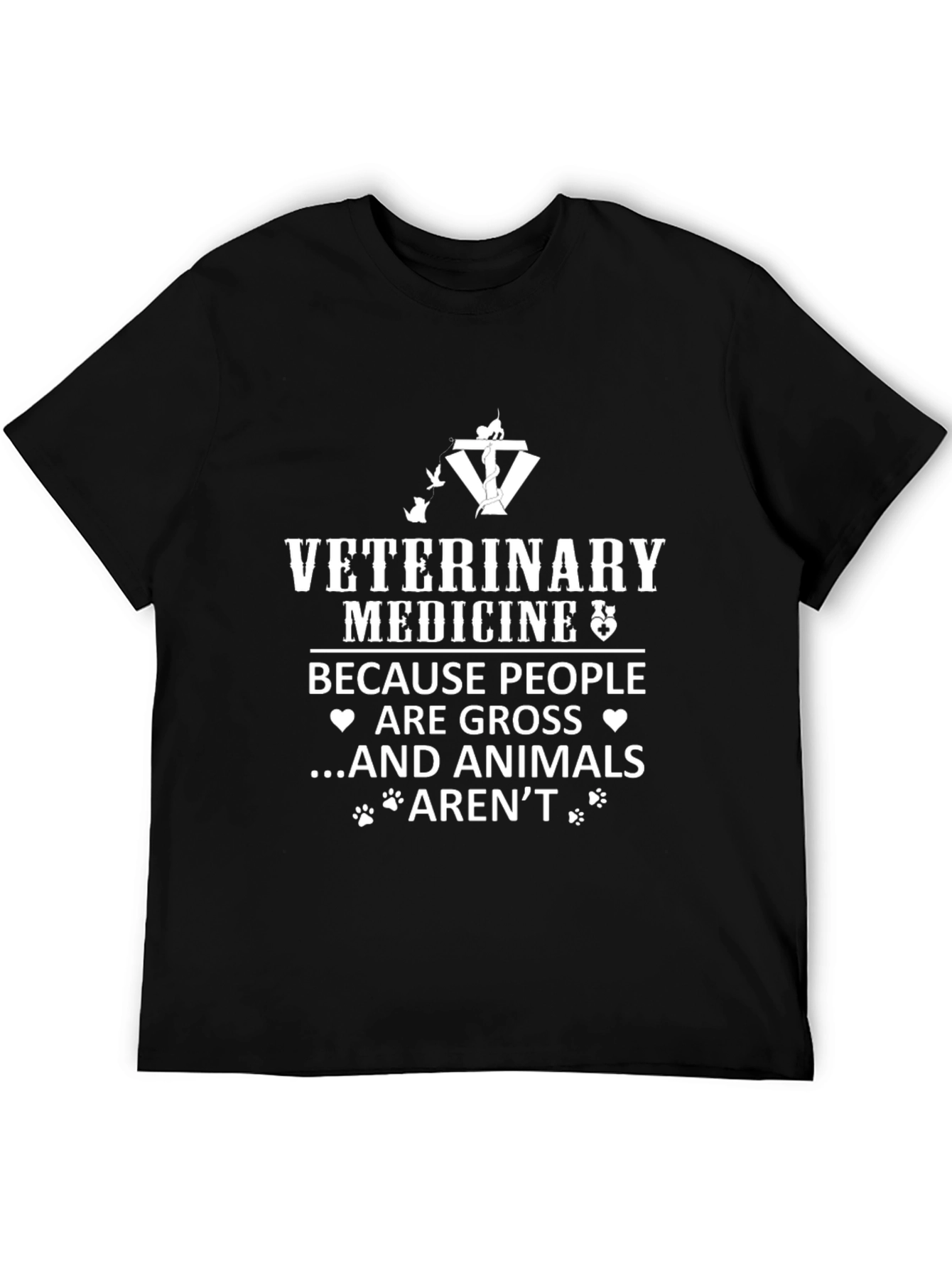 Show off your love for animals with this unique black t-shirt. Featuring a bold white graphic that reads "VETERINARY MEDICINE BECAUSE PEOPLE ARE GROSS...AND ANIMALS AREN'T" complemented by paw prints, hearts, and a veterinary symbol at the top, this tee is perfect for any animal lover or veterinary professional. Made from comfortable material, it's ideal for everyday wear, casual outings, or showing your support at veterinary events. A fun and lighthearted way to express your passion for animal care.