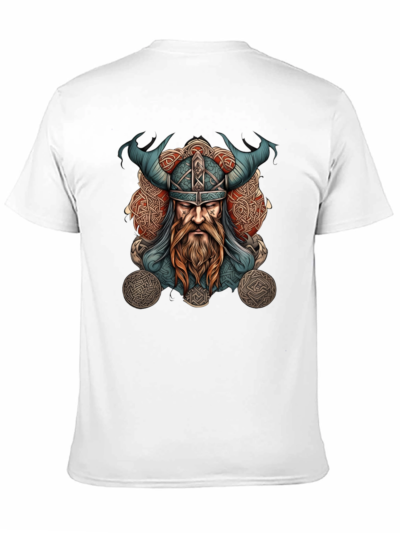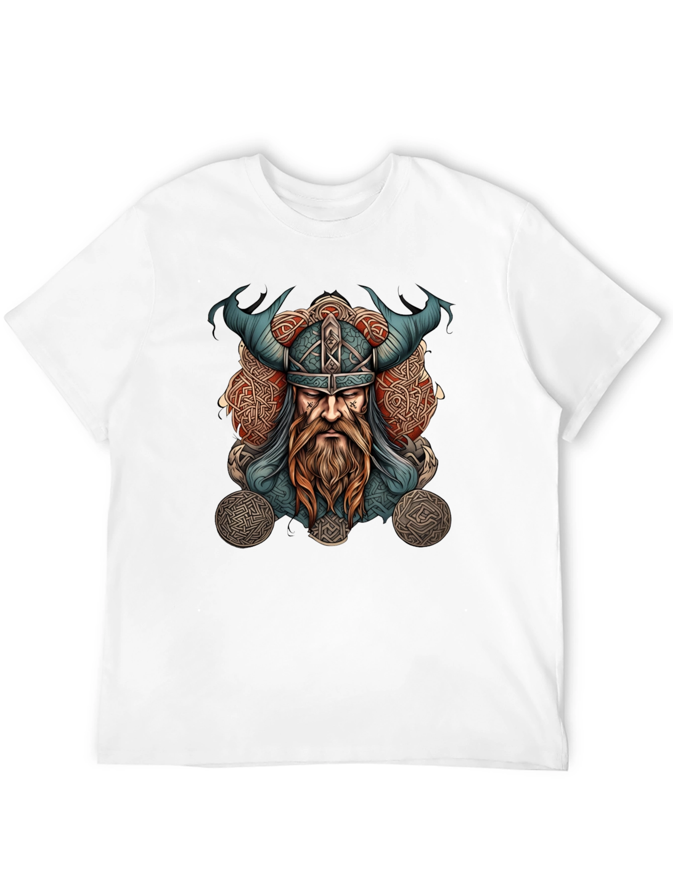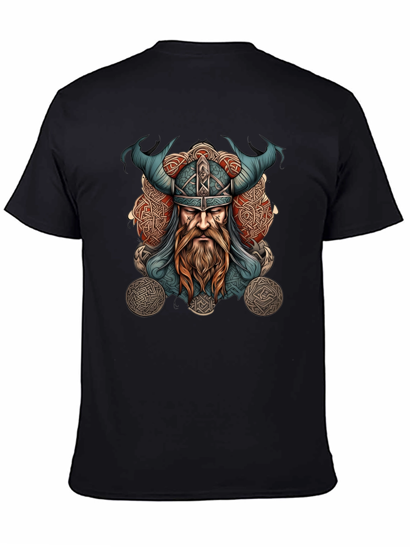 Embrace Norse mythology with this striking black t-shirt. The detailed graphic features a fierce Viking warrior with a horned helmet, intricate Celtic knotwork, and flowing beard, all rendered in a vibrant color palette. Made from a soft and comfortable fabric, this tee is perfect for casual wear, themed events, or expressing your unique style. Stand out from the crowd and showcase your appreciation for Viking culture with this eye-catching shirt. A must-have for history enthusiasts and anyone looking to add a touch of ancient power to their wardrobe.