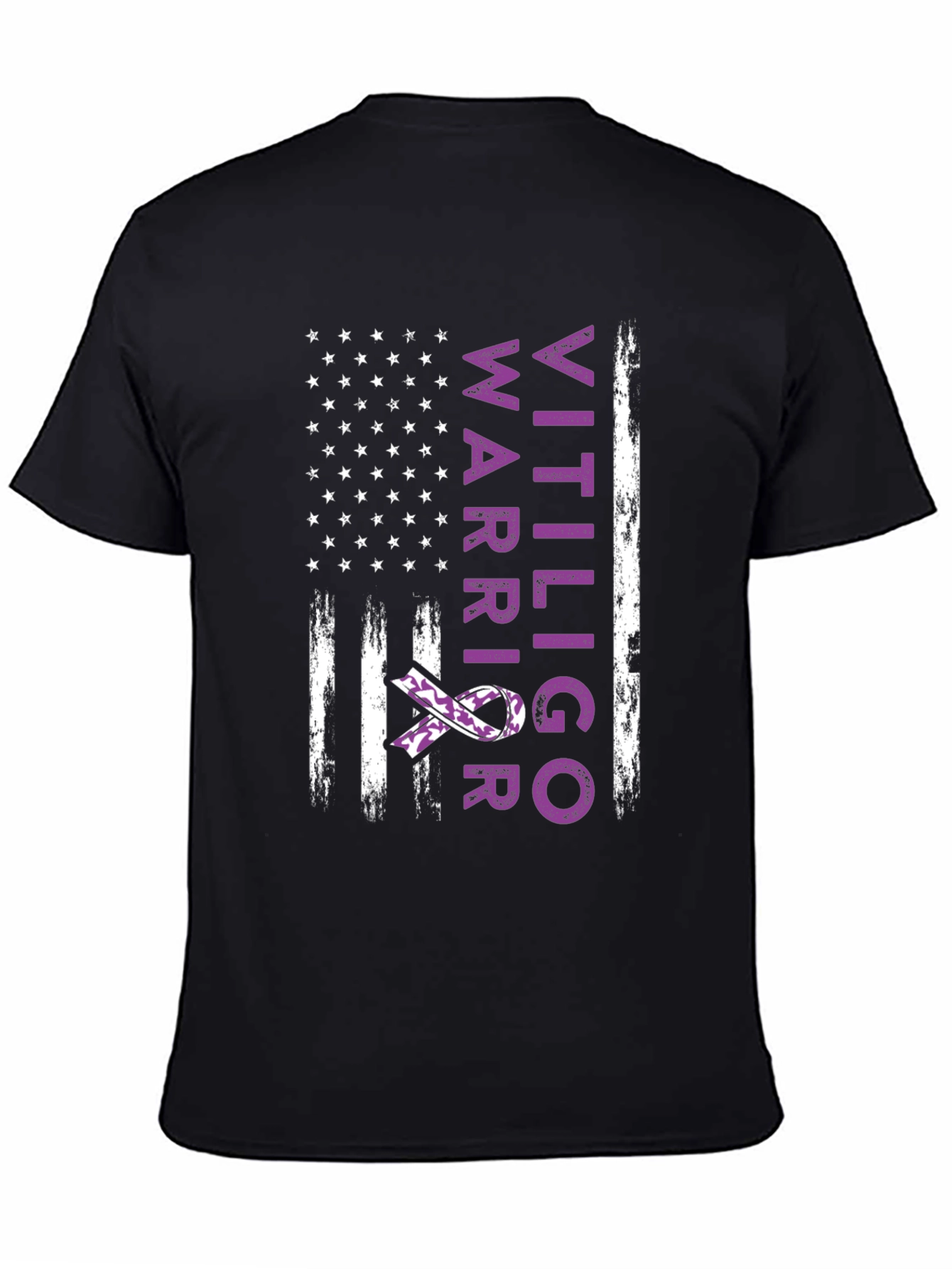 Show your support with this unique Vitiligo Warrior T-shirt. This black tee features a distressed American flag design with purple 'Vitiligo Warrior' text and a coordinating purple ribbon, symbolizing awareness. Made from a comfortable, breathable fabric, this shirt is perfect for everyday wear, awareness walks, or support group meetings. Display your pride and solidarity with this meaningful and stylish tee. A great gift for Vitiligo fighters and supporters.