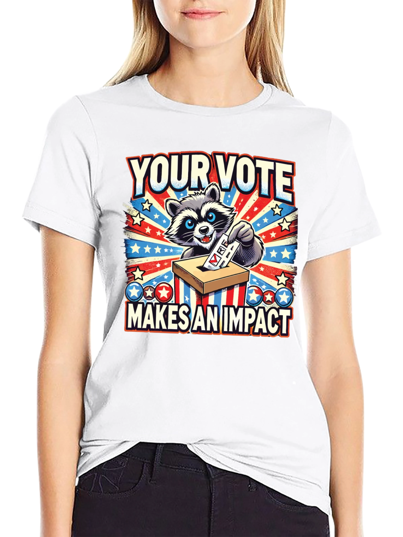 Show your civic pride with this unique graphic t-shirt! Featuring a charming raccoon character casting their vote, this shirt boldly declares "Your Vote Makes An Impact". The design incorporates classic American elements like stars and stripes for a patriotic flair. Made from a comfortable-looking black fabric, this tee is perfect for casual wear, political rallies, or simply expressing your belief in the power of democracy. Stand out and spark conversations with this eye-catching and meaningful design. A great gift for politically engaged friends and family!