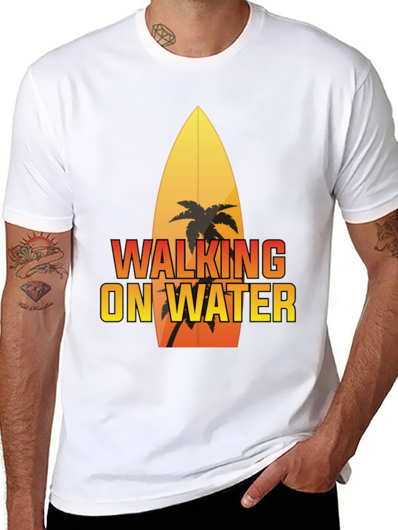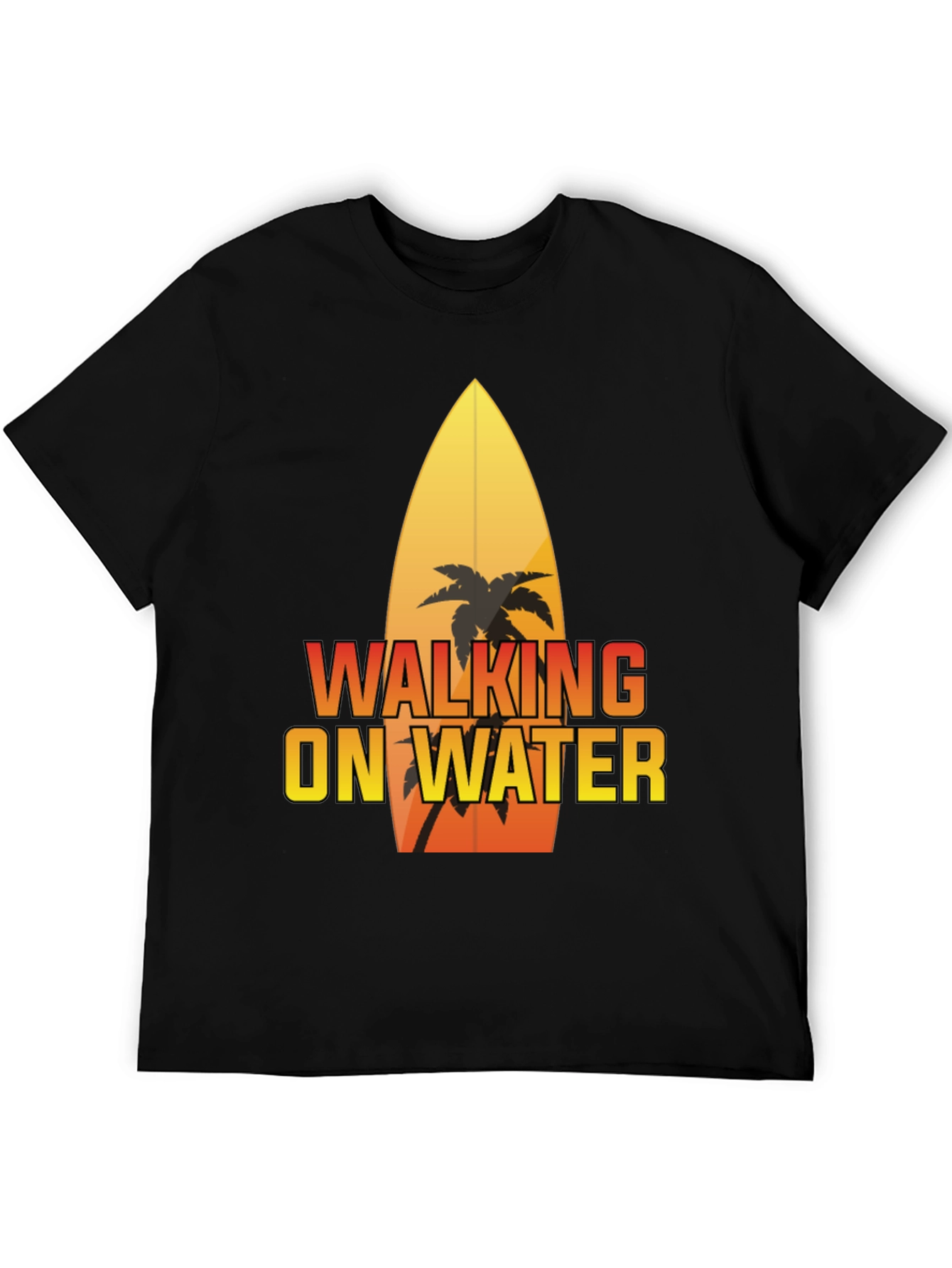 Ride the wave in style with this unique black t-shirt! The bold graphic features a surfboard silhouette with a vibrant sunset gradient, palm trees, and the phrase "Walking on Water" in a eye-catching, stacked font. Perfect for surfers, beach lovers, or anyone who wants to add a touch of summer to their wardrobe. Made from a soft, comfortable fabric, this tee is ideal for casual wear, beach days, or layering. Stand out from the crowd with this original design and embrace the laid-back surf lifestyle.