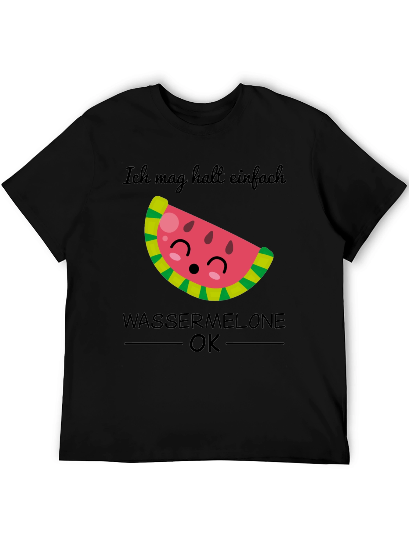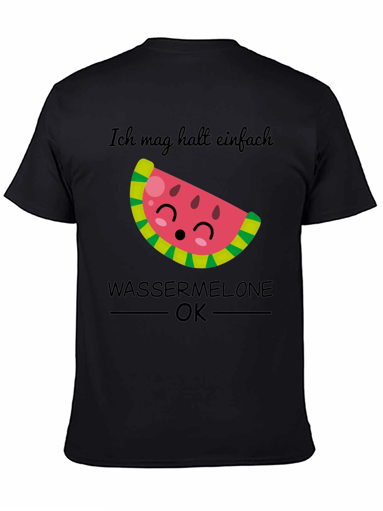 This stylish black t-shirt features a playful graphic of a cute watermelon slice with smiling face. The design includes the text "Ich mag halt einfach WASSERMELONE OK" (I just like WATERMELON OK), making it a fun and quirky choice for casual wear. Made from comfortable fabric, it's perfect for warm weather outings, picnics, or just lounging around. Show off your love for watermelon with this unique tee that's sure to spark conversations and bring a smile to everyone's face. Pair it with shorts or jeans for a relaxed and fun look.
