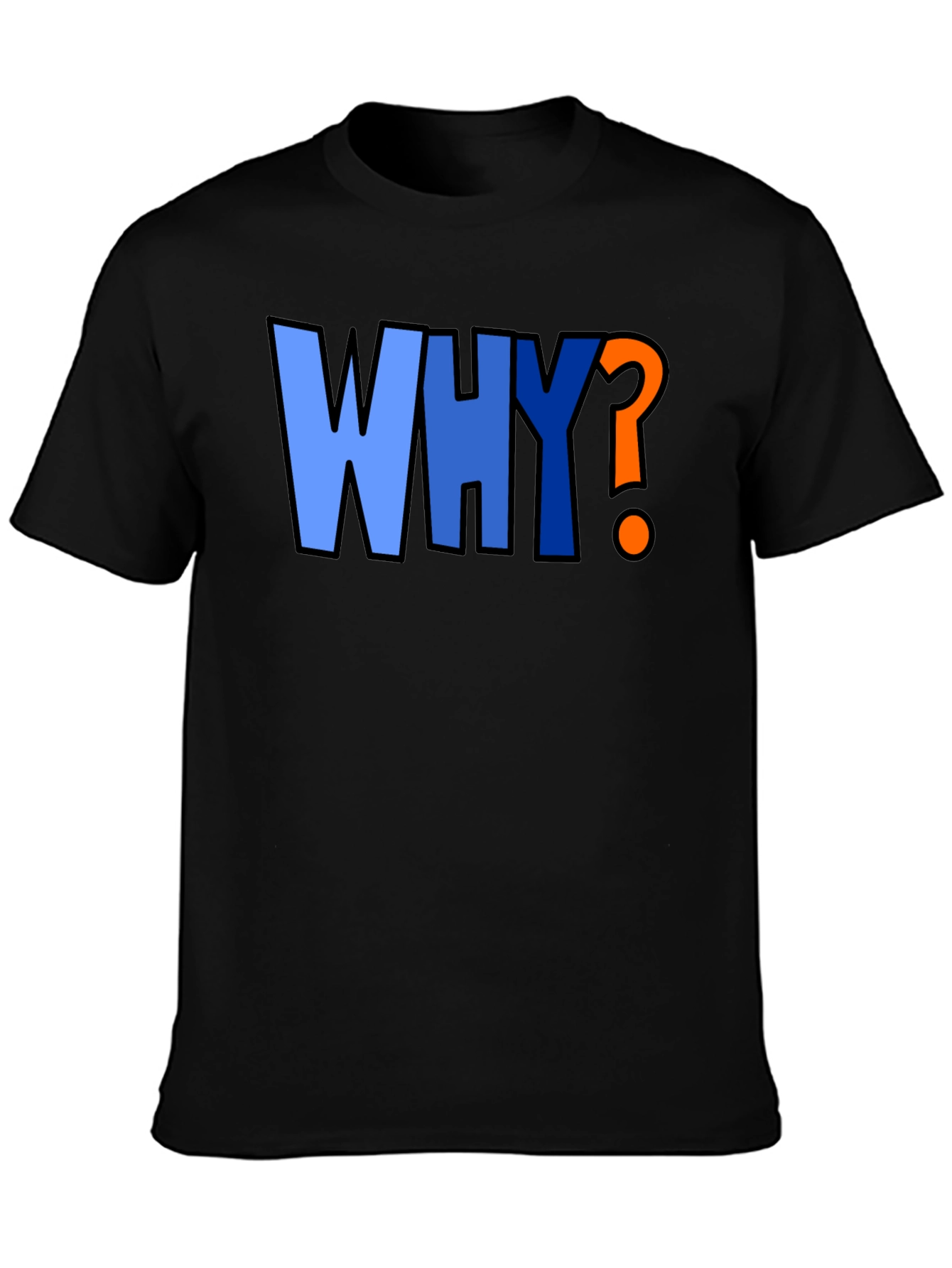 This black crew neck t-shirt features a bold graphic print that asks the ultimate question: "WHY?" The word "WHY" is written in a light to dark gradient blue with a dark blue outline, and the question mark is an eye-catching orange. Made from a comfortable-looking cotton or cotton blend fabric, this tee is perfect for casual wear. The design is sure to spark conversation and add a touch of humor to your wardrobe. Wear it to express your inquisitive side, make a statement, or simply for a unique look.