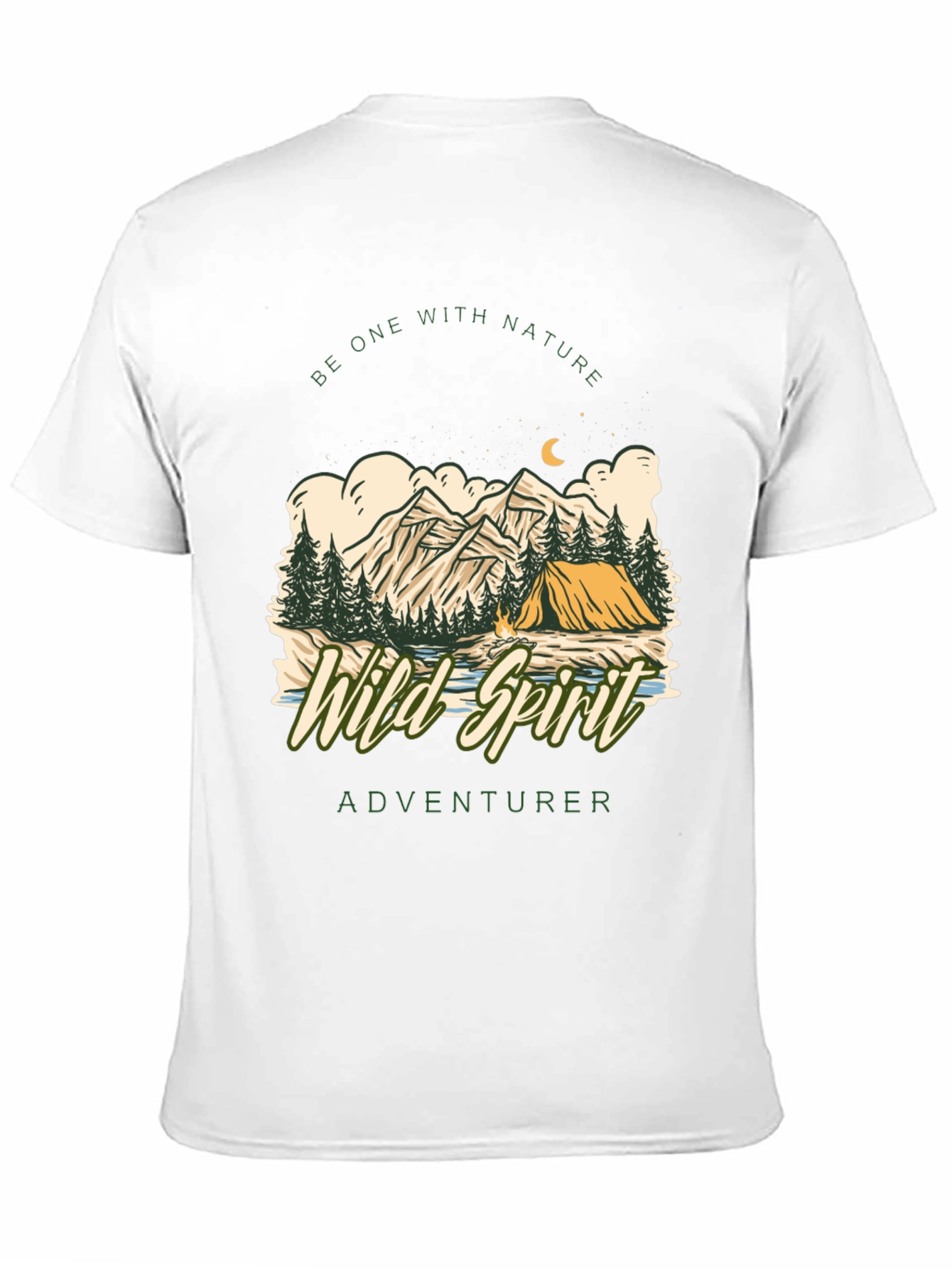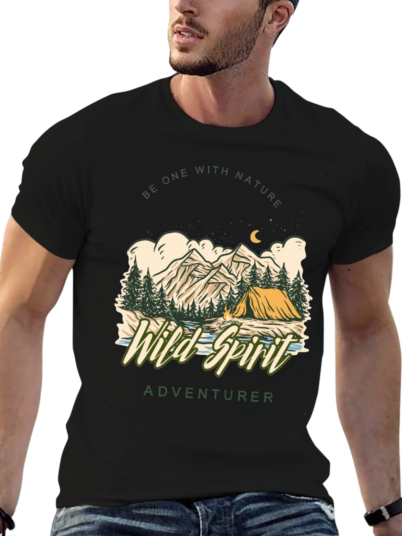 Embrace your adventurous side with this stylish black t-shirt. Featuring a captivating graphic design of a mountain scene with a tent under the moonlight, this tee evokes a sense of wanderlust. The words "Wild Spirit Adventurer" are incorporated into the design. Perfect for nature lovers and outdoor enthusiasts, this tee is made from a soft, breathable fabric that ensures all-day comfort. Pair it with jeans or shorts for a casual, cool look that showcases your free spirit. Whether you're hiking in the mountains or exploring a new city, this t-shirt is a must-have for your wardrobe. Show off your passion for adventure with this unique and eye-catching tee.