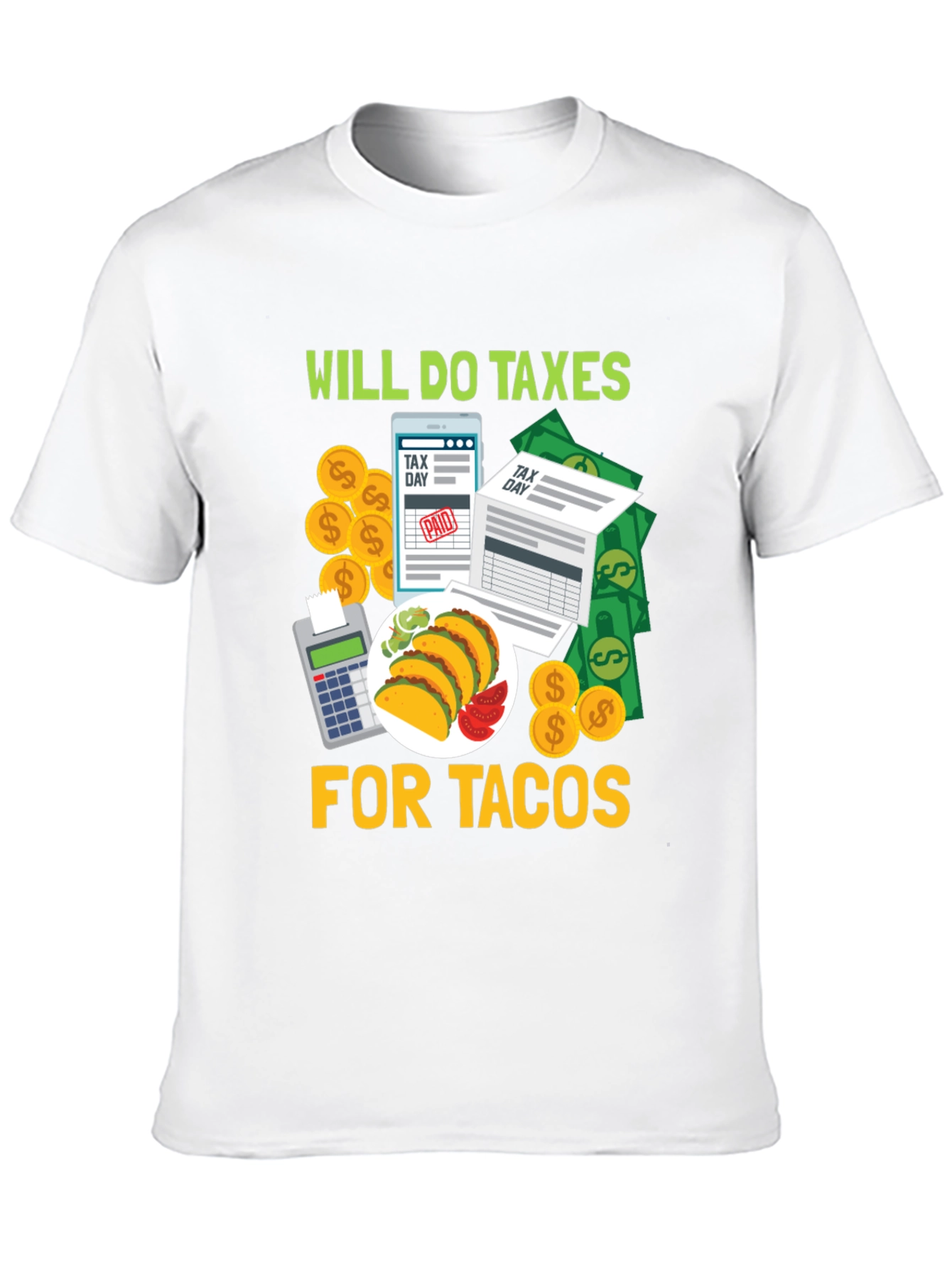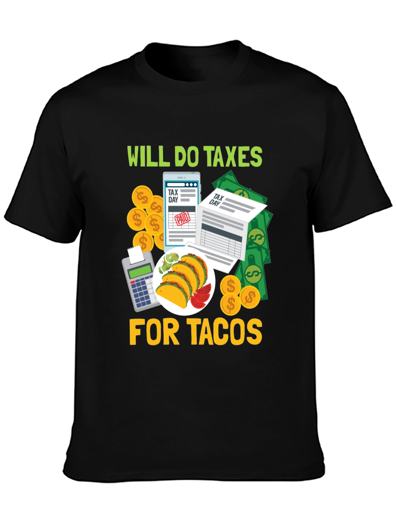 This black t-shirt features a humorous design that speaks to the heart of every tax season warrior! Boldly printed are the words 'WILL DO TAXES FOR TACOS', accompanied by fun illustrations of tax documents, coins, calculator, and delicious tacos. Perfect for accountants, bookkeepers, or anyone who appreciates a good deal and a great meal. It's ideal for casual Fridays, tax season events, or just showing off your unique sense of humor. This comfortable and eye-catching t-shirt is sure to spark conversations and maybe even score you a taco or two!