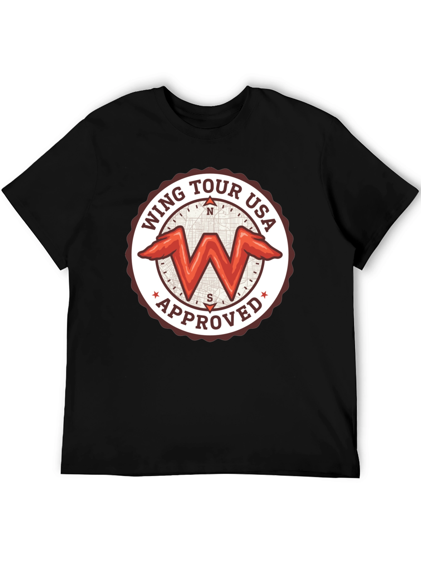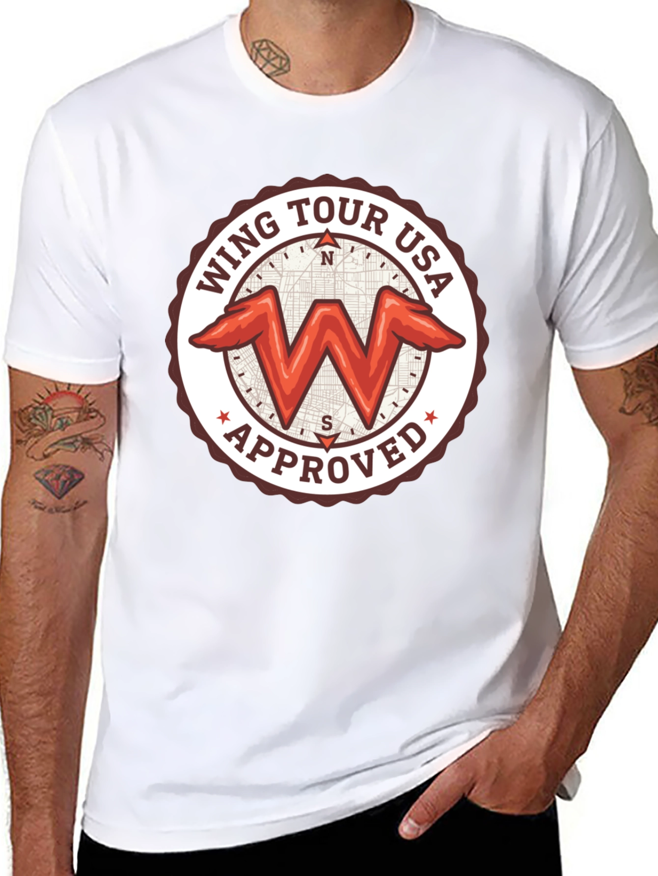 Show your love for wings with this unique Wing Tour USA t-shirt. This stylish black tee features a vintage-inspired graphic design with the words 'Wing Tour USA' and 'Approved' encircling a bold, stylized 'W' with wing accents. The design incorporates a compass with North and South directions. Perfect for wing enthusiasts and foodies, this comfortable t-shirt is ideal for casual wear, BBQ outings, or your next wing tasting event. A great conversation starter and a must-have addition to any wing lover's wardrobe!