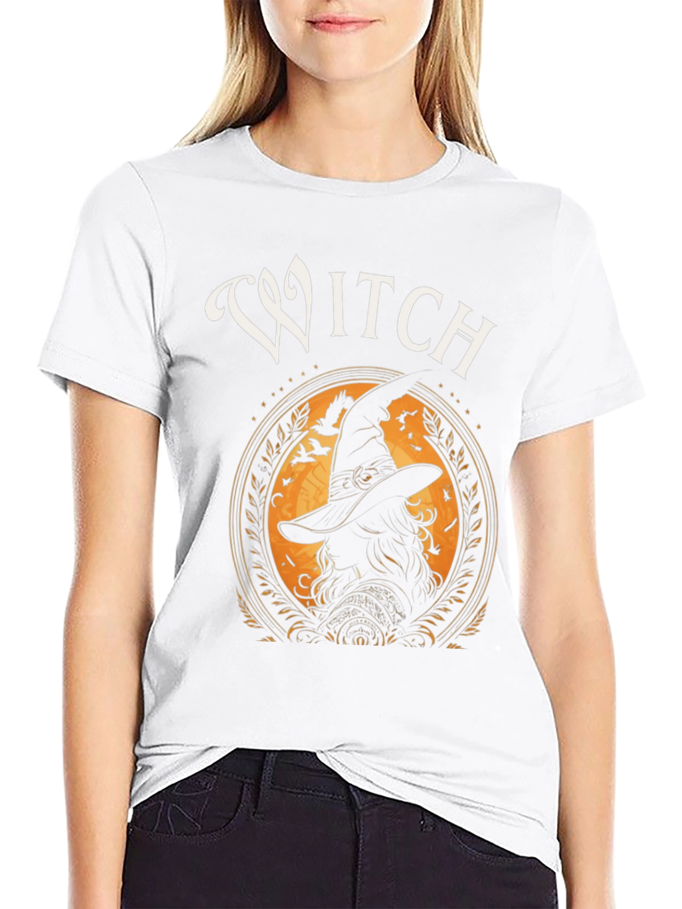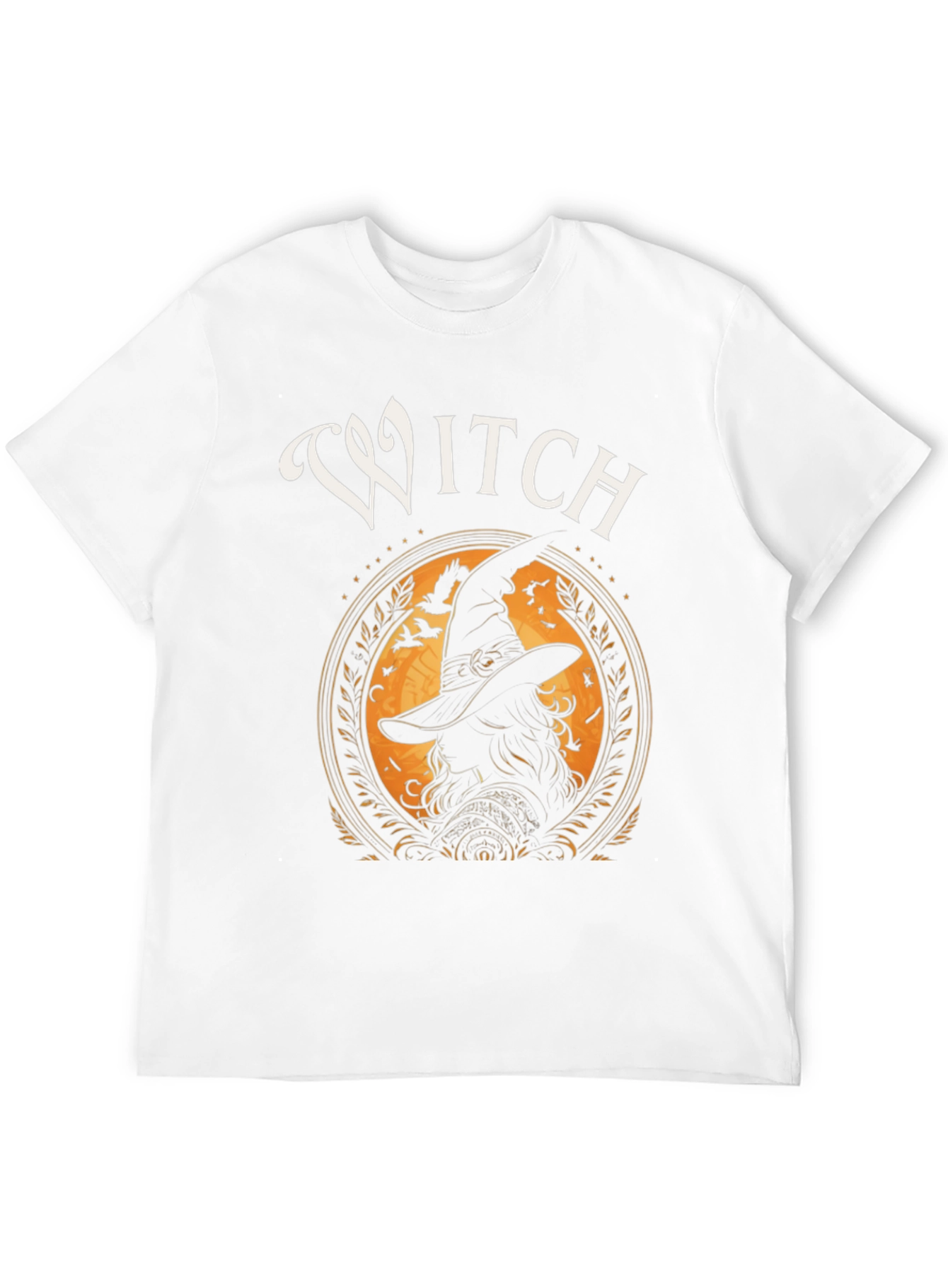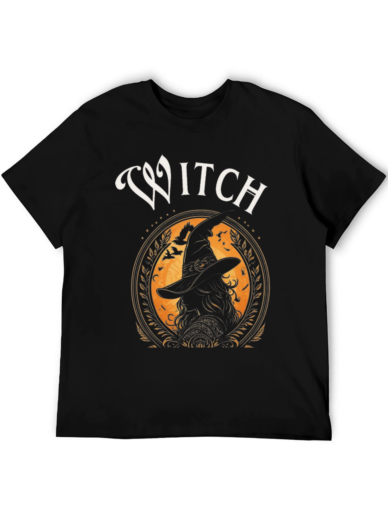 Embrace the spooky season with this stylish black t-shirt featuring a captivating "Witch" graphic. The design showcases a silhouette of a witch framed by an ornate orange circle, complete with flying crows and whimsical details. Made from a comfortable, soft fabric, this tee is perfect for casual wear, Halloween parties, or expressing your love for all things mystical. Its striking print ensures you'll stand out, making it an ideal gift for the witch or Halloween enthusiast in your life. Add a touch of enchantment to your wardrobe with this unique and eye-catching t-shirt. Ideal for men's fashion, it's a statement piece that combines comfort and style.