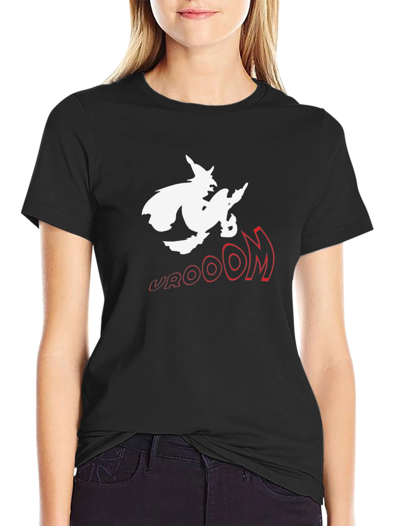 Show off your spooky spirit with this black t-shirt featuring a witch riding a broom! The design includes a bold, stylized "VROOOM" graphic that adds a playful touch. Perfect for Halloween parties, casual outings, or simply expressing your love for all things witchy. Comfortable and stylish, this t-shirt is sure to turn heads and spark conversations.