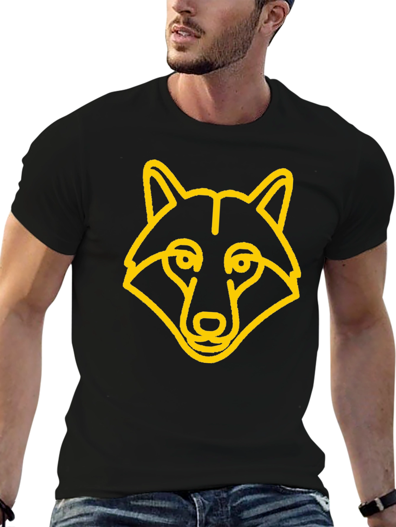 Show off your wild side with this stylish black t-shirt featuring a striking, minimalist wolf head graphic in vibrant yellow. The clean, modern design is eye-catching and perfect for casual wear. This tee appears to be made from a soft and comfortable fabric, ensuring all-day comfort. Its classic cut and bold design make it a versatile addition to any wardrobe. Ideal for everyday wear, concerts, or expressing your unique style, this wolf graphic tee will turn heads and start conversations. Get yours today and unleash your inner wolf!
