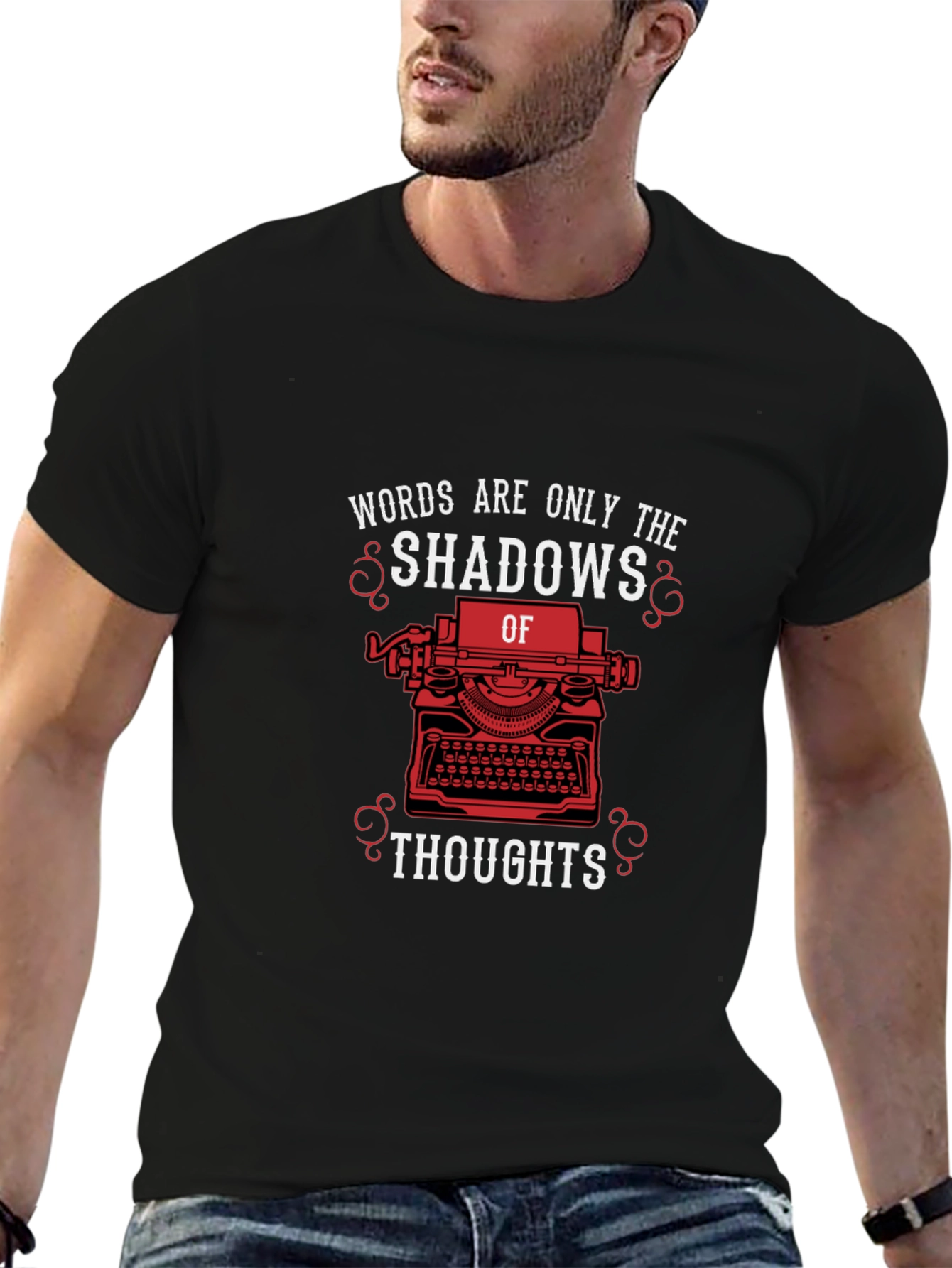 Express your inner writer with this stylish black t-shirt. Featuring a vintage typewriter graphic with the phrase 'Words are only the shadows of thoughts', this tee is perfect for authors, poets, and anyone who appreciates the power of words. Made from comfortable fabric, it's ideal for everyday wear or creative writing sessions. This unique design adds a touch of literary flair to your wardrobe. Whether you're working on your next novel or simply want to make a statement, this t-shirt is a must-have.