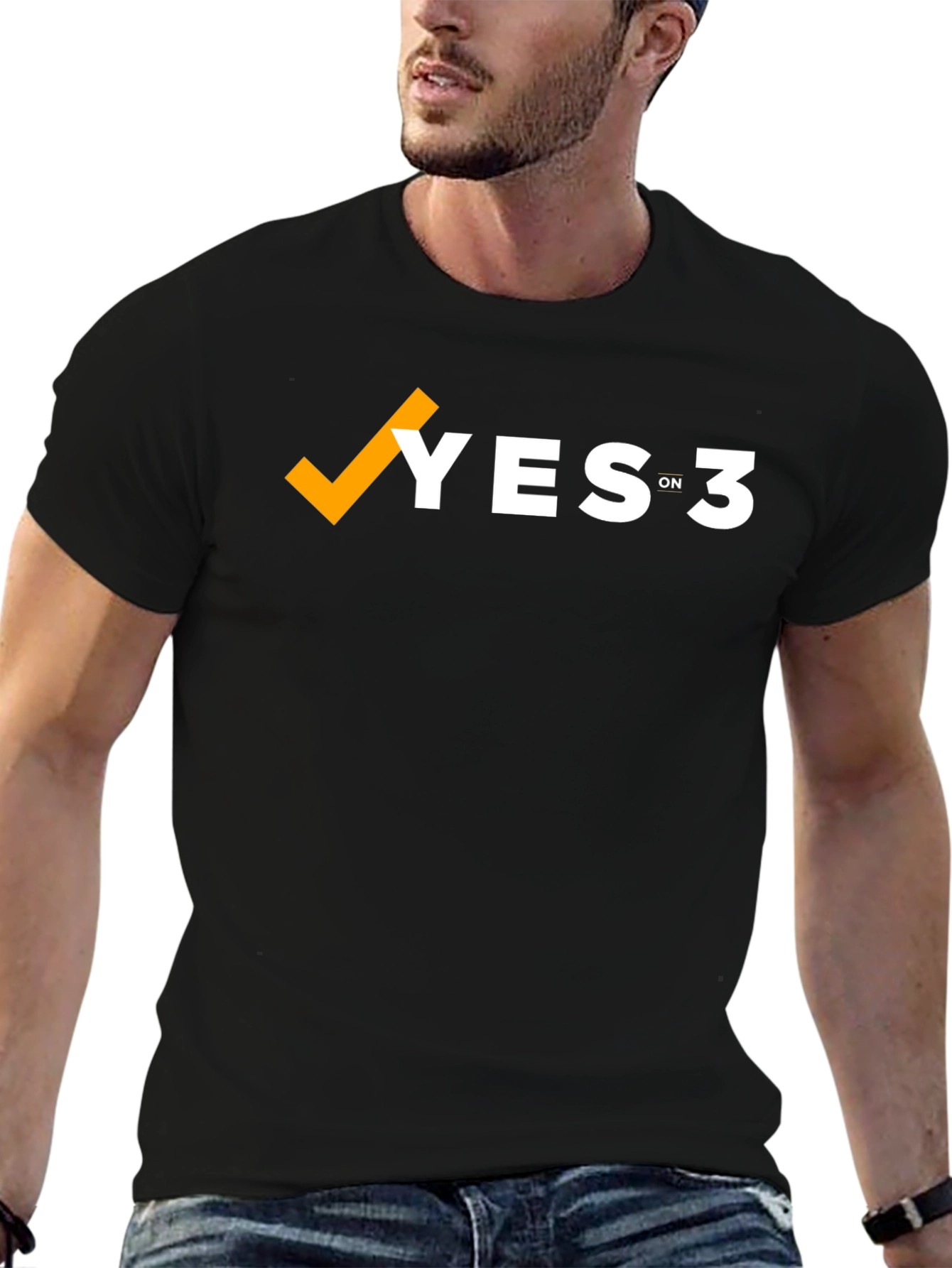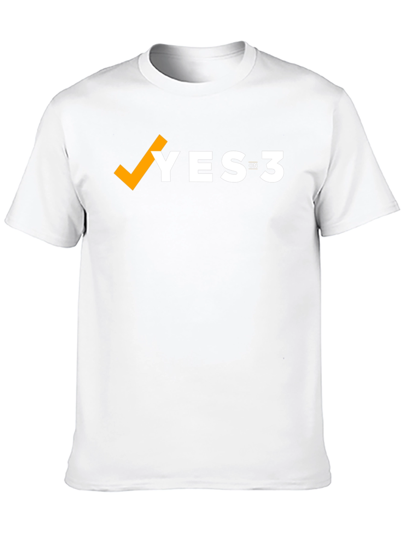 Show your support with this classic black t-shirt featuring the "YES on 3" message. The design incorporates a bold orange checkmark, followed by "YES" in white block letters. The "ON 3" is smaller and in white. This short-sleeved tee appears to be made from a comfortable material. It's an ideal way to express your opinion at rallies, events, or during everyday wear. Grab yours today and make a statement!