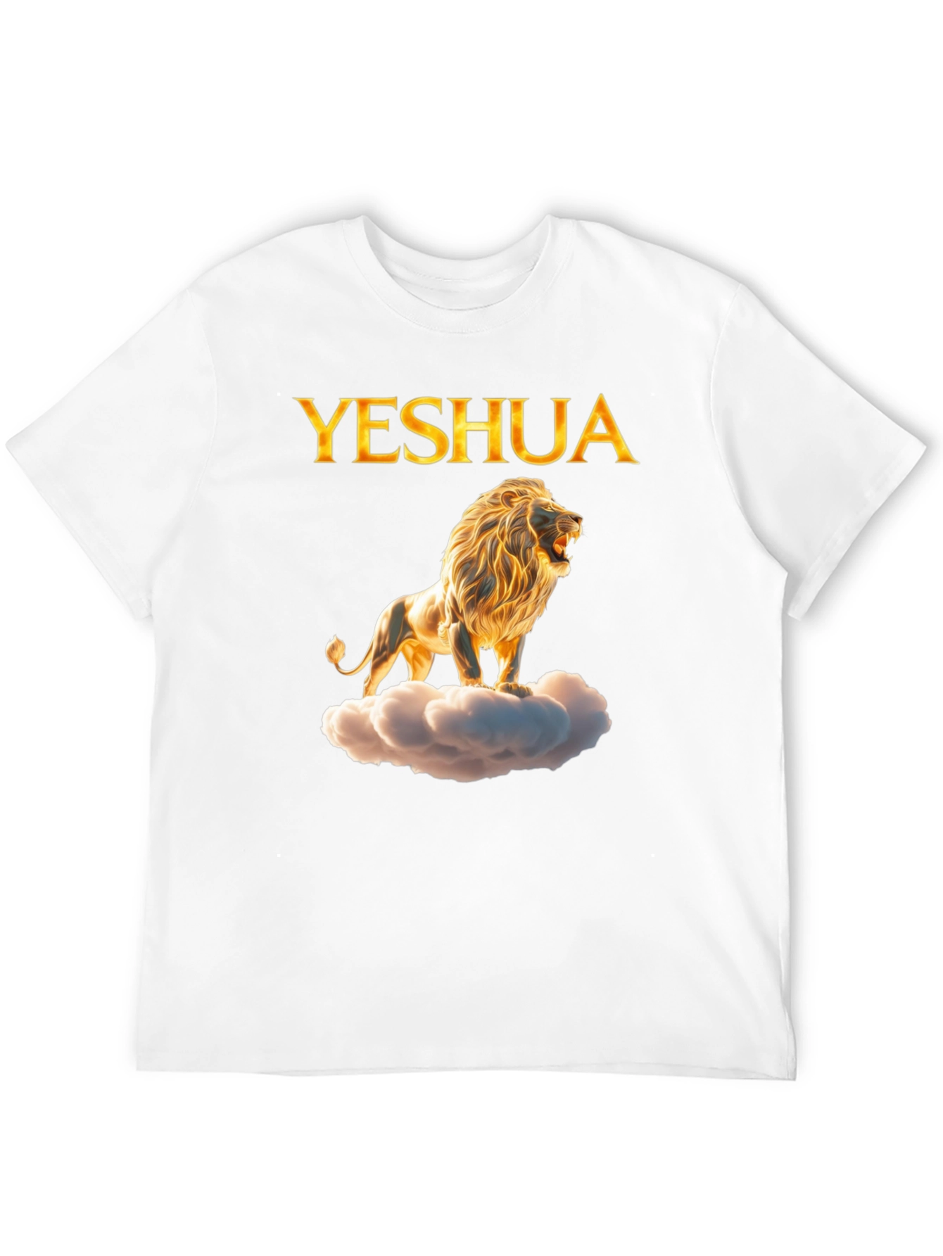 Show your faith with this eye-catching Yeshua graphic t-shirt. This black tee features the word "YESHUA" in bold, golden letters above a majestic, golden lion standing atop a fluffy white cloud. The design exudes power and serenity, making it a conversation starter and a unique addition to your wardrobe. Made from a soft, comfortable fabric, this t-shirt is perfect for everyday wear, church events, or casual outings. Express your beliefs with style and make a statement with this beautifully designed t-shirt. It is an ideal gift for anyone who wants to wear and share their faith.