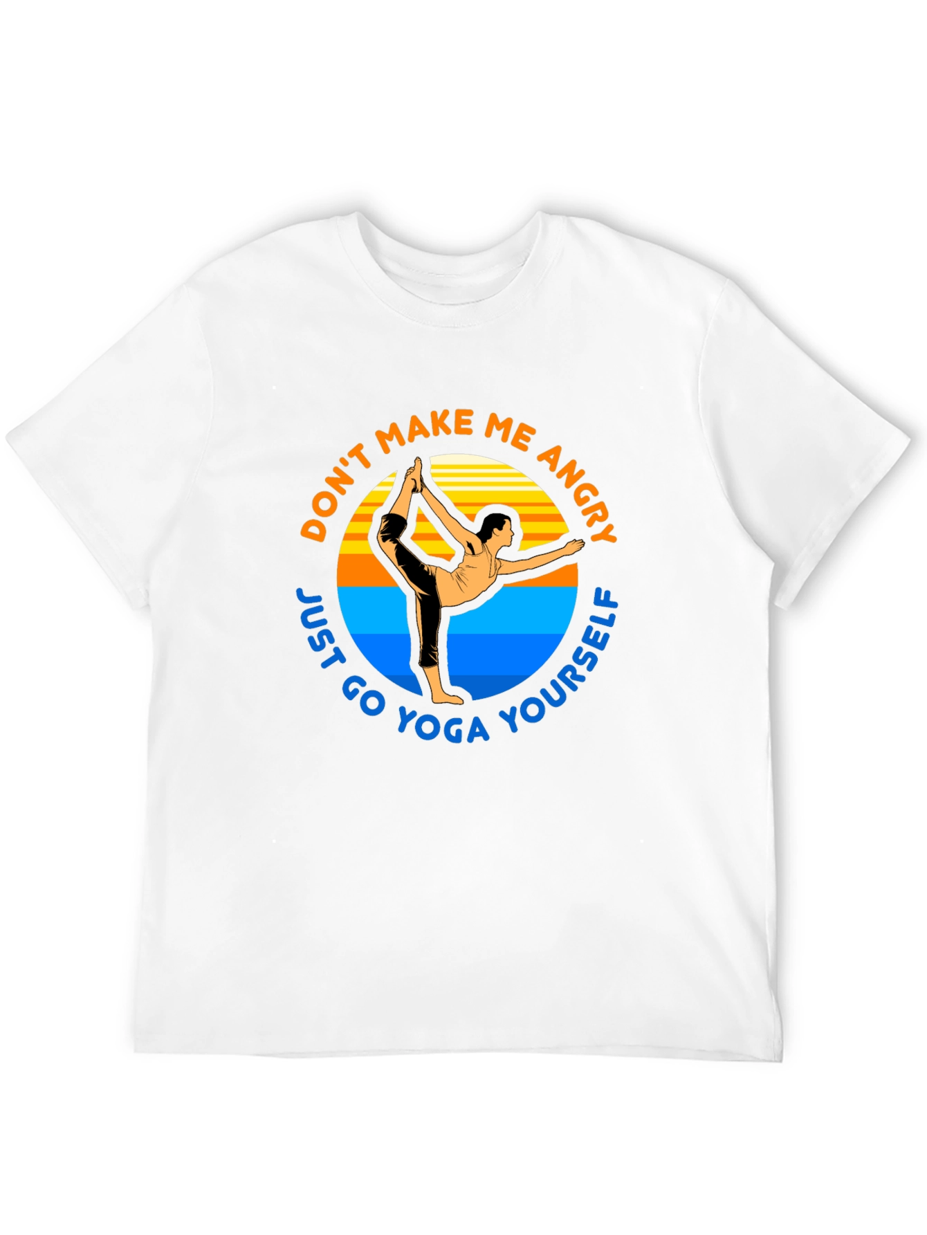 This black t-shirt features a humorous and stylish design. A person in a yoga pose is the central element, set against a vibrant, circular background with horizontal color bands ranging from yellow to blue. Encircling the image are the words "DON'T MAKE ME ANGRY" at the top and "JUST GO YOGA YOURSELF" at the bottom, creating a playful message. This casual tee is perfect for yoga enthusiasts with a sense of humor, fitness lovers, or anyone who appreciates unique graphic designs. Made from a comfortable fabric, it's ideal for everyday wear.