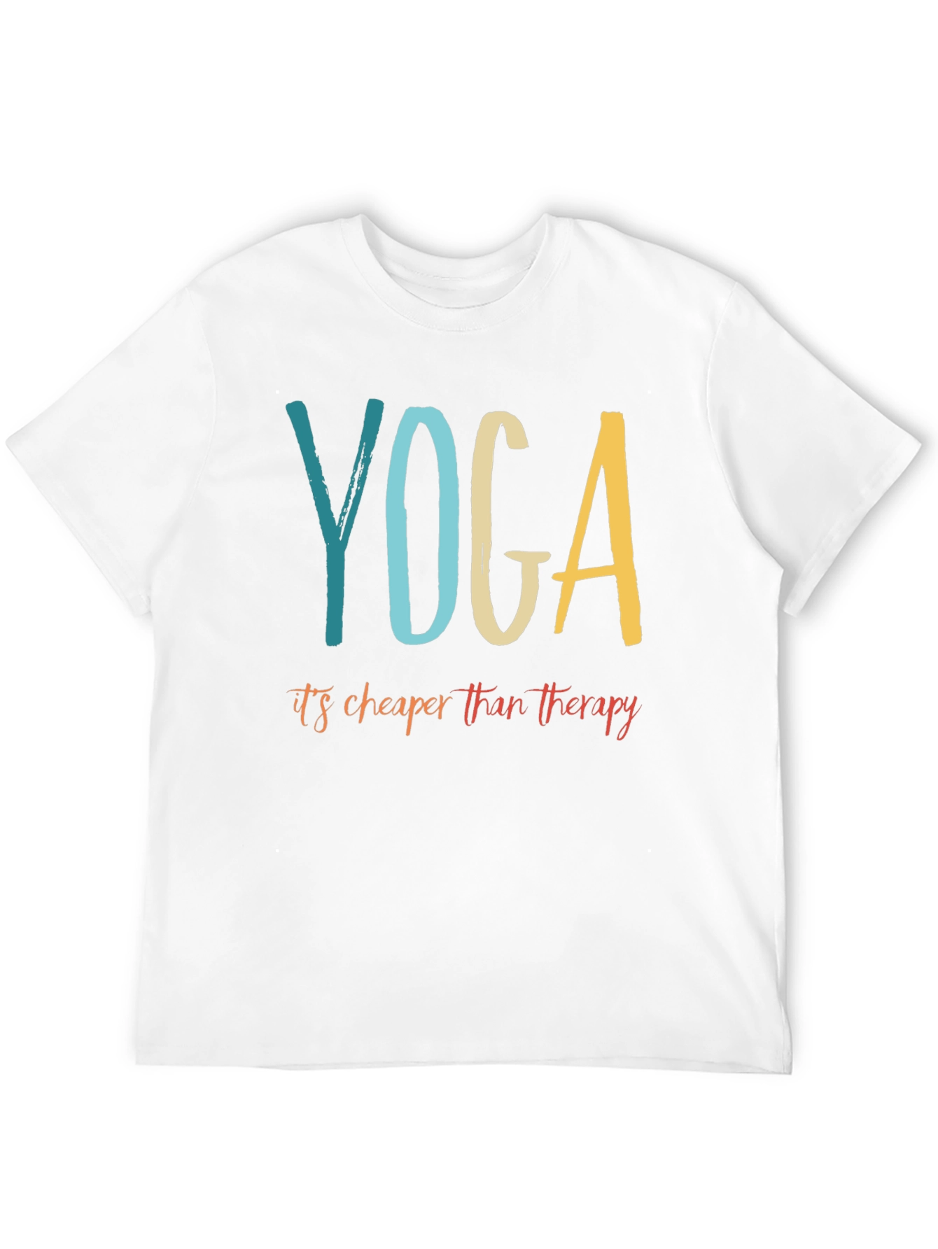 This classic black t-shirt features a playful and relatable message for yoga enthusiasts. The design displays the word "YOGA" in bold, individual colors. Beneath this, the witty phrase "it's cheaper than therapy" is printed in a warm, inviting script. The tee is made from what appears to be a comfortable, soft cotton blend, making it perfect for everyday wear or a light workout. Its casual style is ideal for expressing your love for yoga. This t-shirt is a great conversation starter and a fun way to promote wellness and self-care. Wear it to your next yoga class, casual outing, or simply while relaxing at home.