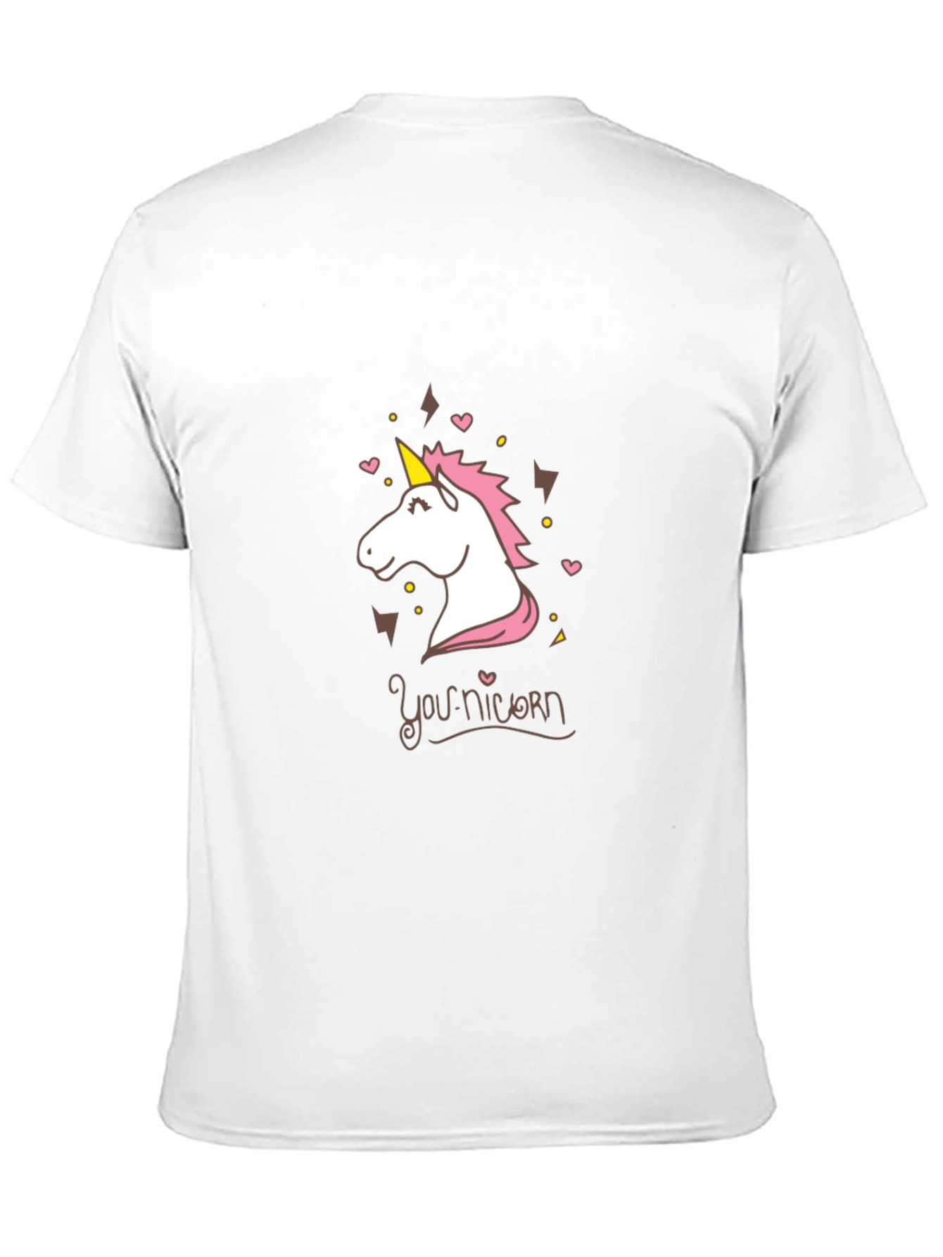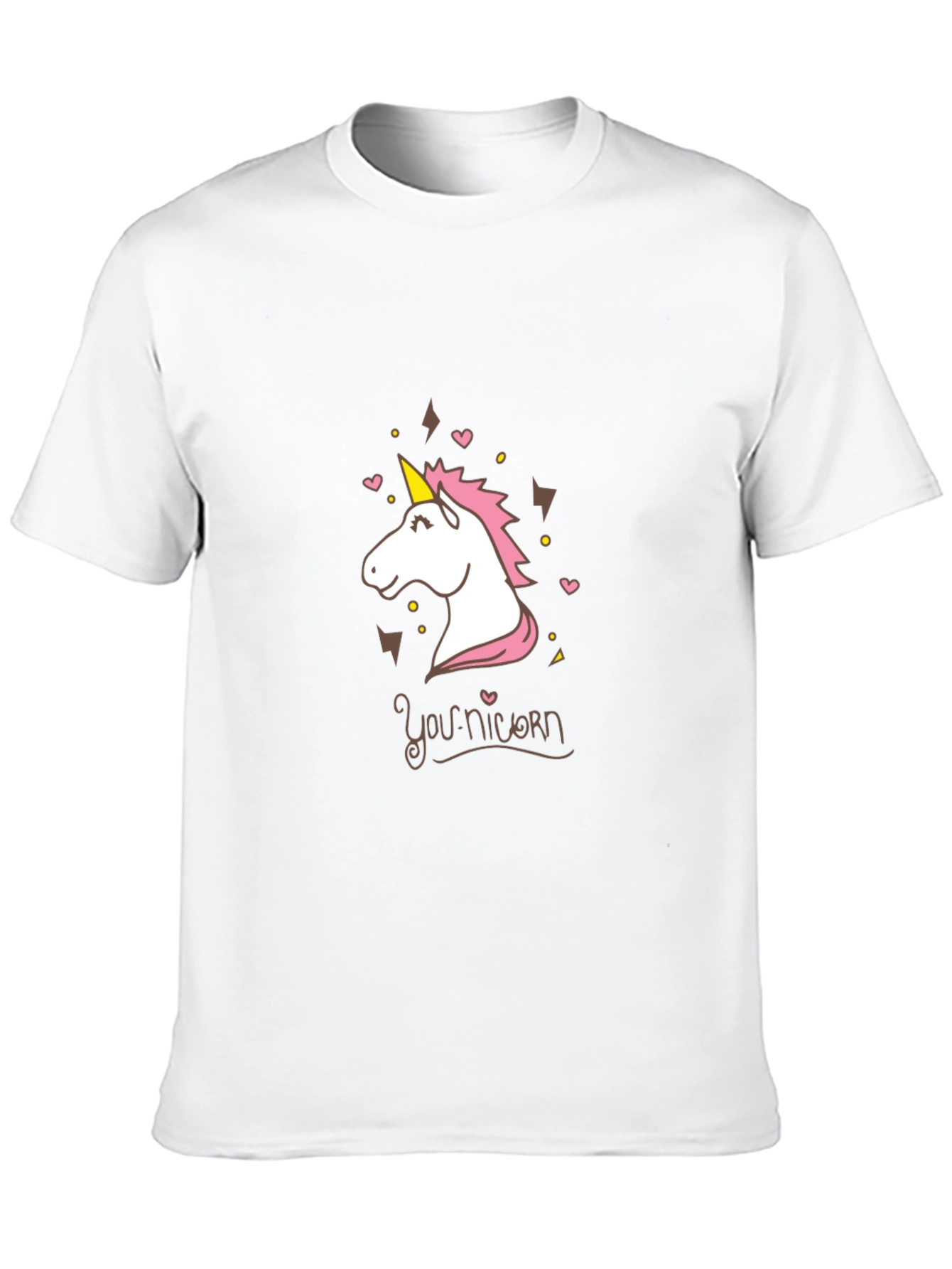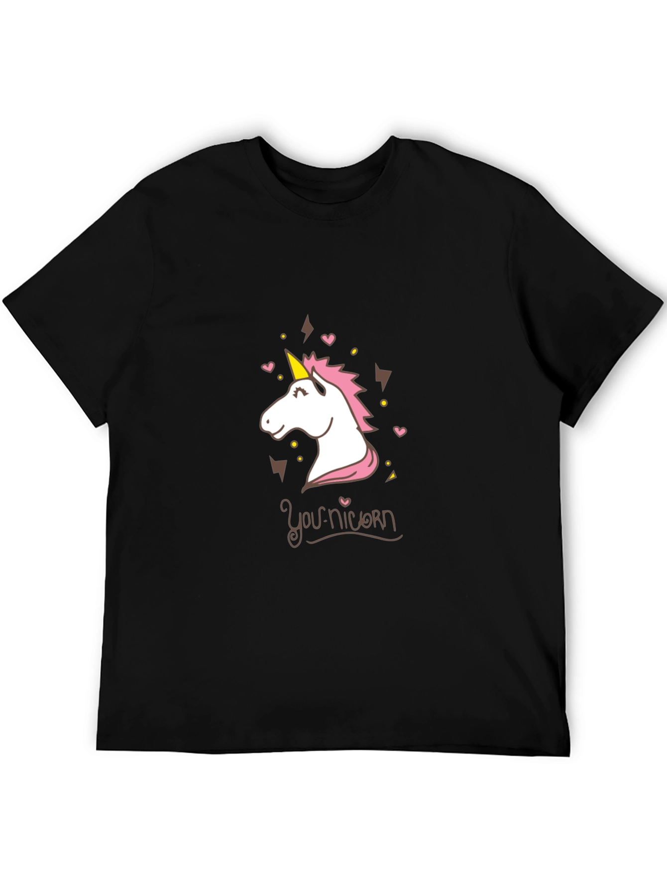 Express yourself with this charming black T-shirt featuring a delightful unicorn design. The graphic showcases a white unicorn with a golden horn and pink mane, surrounded by hearts and sparkles, adding a touch of whimsy. 'You-nicorn' is playfully scripted beneath, making it a fun and positive statement piece. Crafted from a soft-looking fabric, this tee appears comfortable and breathable for everyday wear. Perfect for casual outings, lounging at home, or gifting to a unicorn enthusiast, this T-shirt combines style and comfort effortlessly.