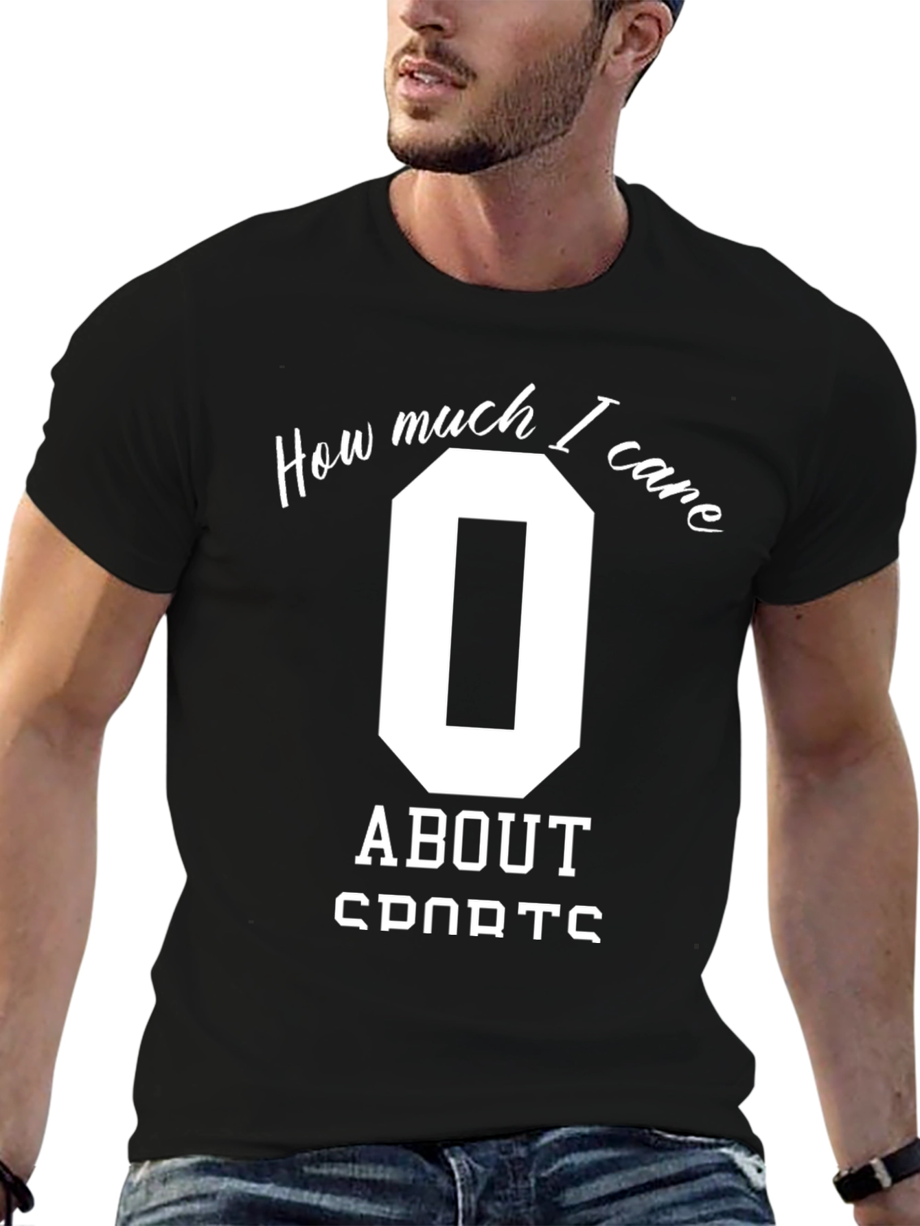 Show your indifference with this bold, black graphic t-shirt. Made from a comfortable, breathable fabric, this tee features a humorous design that reads, "How much I care," accompanied by a large white '0' and the word "SPORTS". Perfect for casual wear, lounging at home, or making a statement. This short-sleeved shirt offers a relaxed fit, ensuring all-day comfort. Ideal for those who prefer sarcasm and humor in their wardrobe, or those who simply aren't sports fans. Add a touch of wit to your everyday style with this unique and attention-grabbing tee!