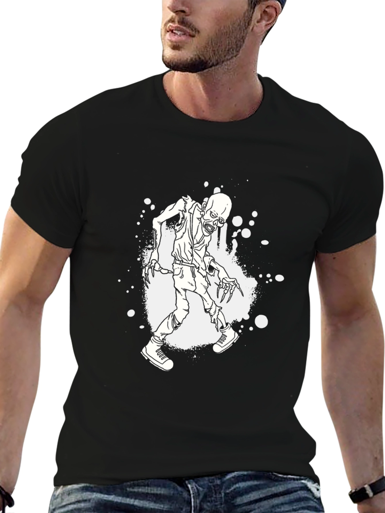 Unleash your inner horror fan with this striking black t-shirt featuring a bold graphic print. The shirt showcases a detailed, stylized zombie illustration in white, set against a splattered background for an edgy, distressed look. Perfect for casual wear, Halloween events, or expressing your unique style, this tee is sure to turn heads. Made from comfortable materials, this t-shirt will keep you comfortable. Whether you're rocking it at a concert or just hanging out with friends, this tee makes a statement. Add this unique zombie graphic tee to your wardrobe today!